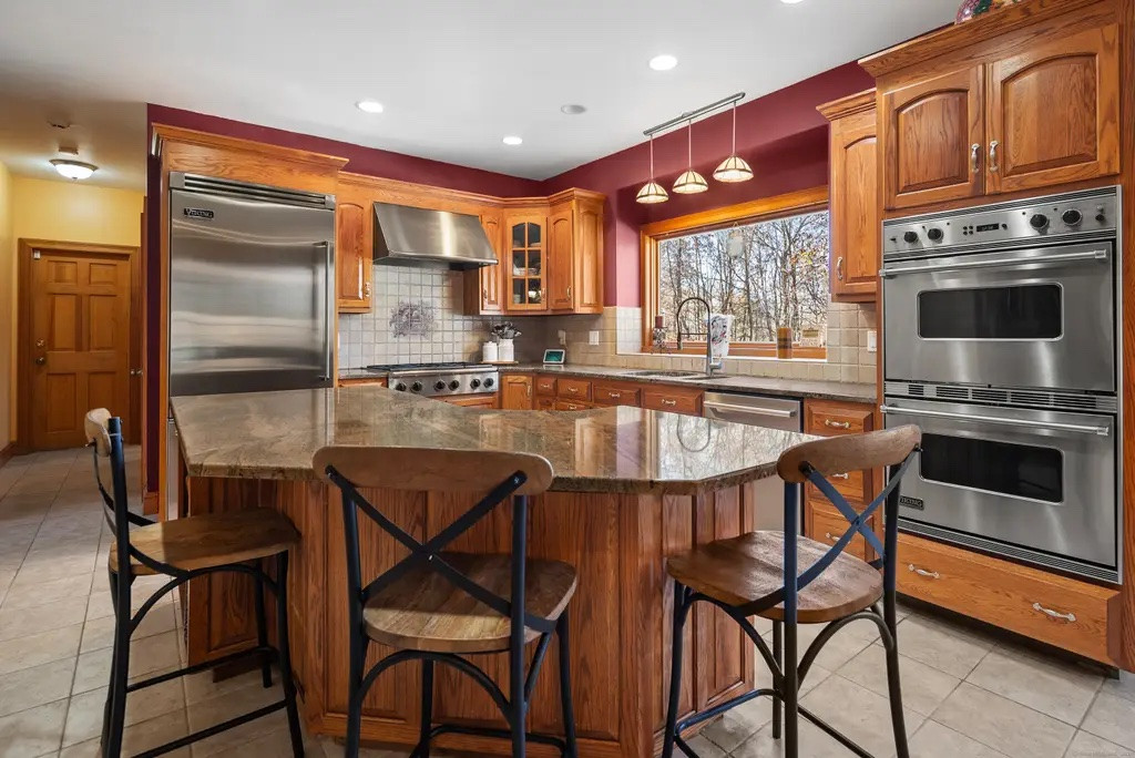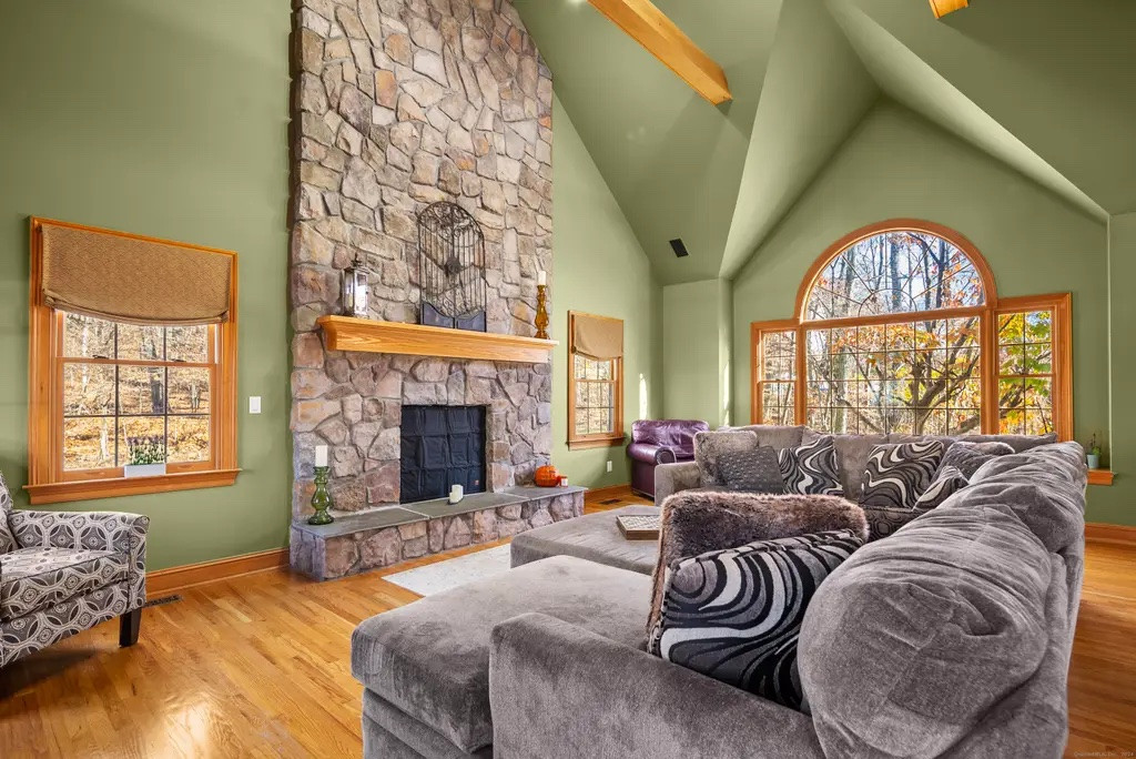 Located in a cul-de-sac, this Goshen home offers a front porch, a large foyer, five bedrooms and four bathrooms. The den/office is furnished with bookcases and the great room includes cathefral ceilings and a floor-to-ceiling stone fireplace. The third-floor loft includes a walkout balcony. Outside is a patio and hot tub. Listed at $950,000 by Coldwell Banker.