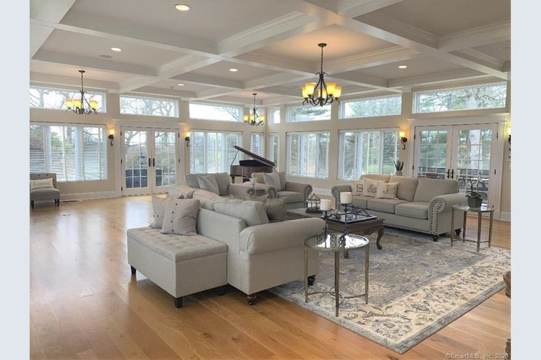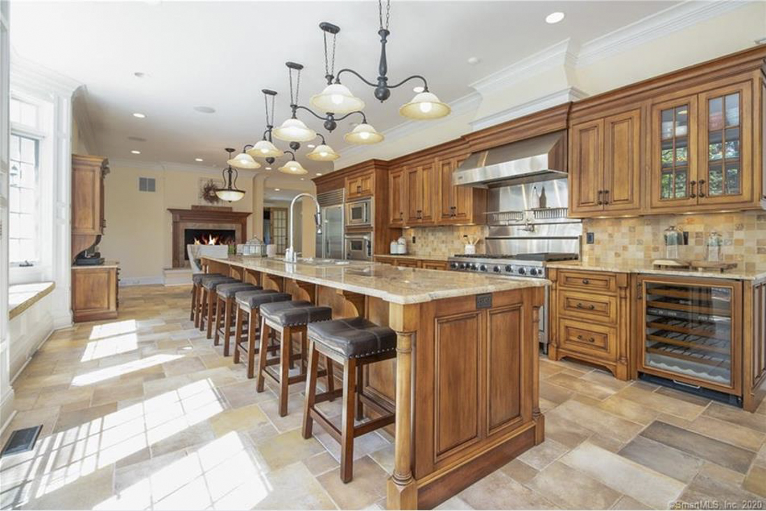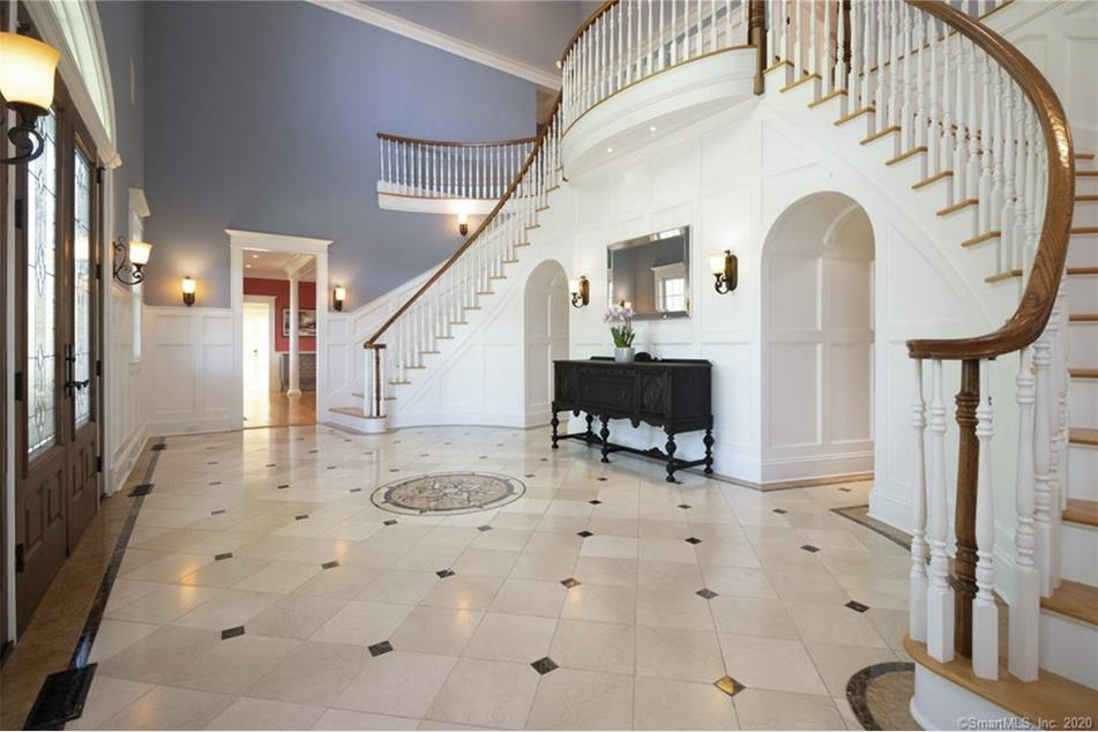 This New Milford mansion has 10,000 square feet of space and over nine acres of land. The house has high ceilings, six fireplaces, three wet bars and a wine cellar. There is full home lighting automation and control for home video, network and audio including exterior surveillance. The property also includes a one-bedroom apartment above the garage, a separate guest house, a gunite saltwater pool and spa with a pool house, a barn, tennis/basketball court and two outdoor kitchens. The area is fenced in and has stone fireplaces, three outdoor fountains, a meditation garden and a dog kennel. Listed for $1,975,000 by Coldwell Banker.