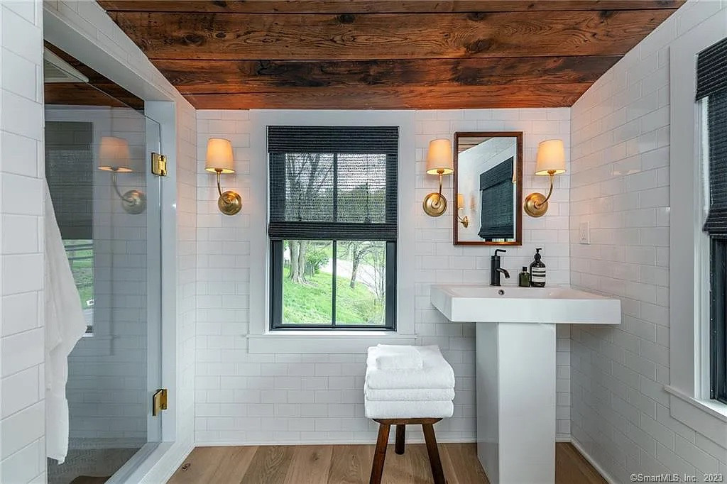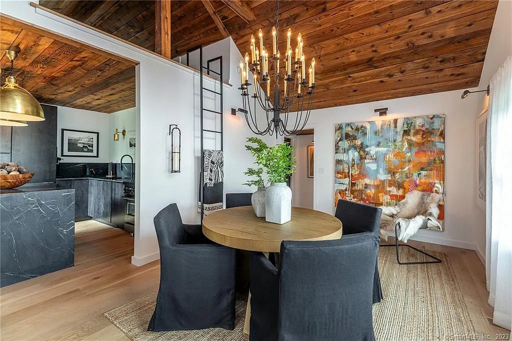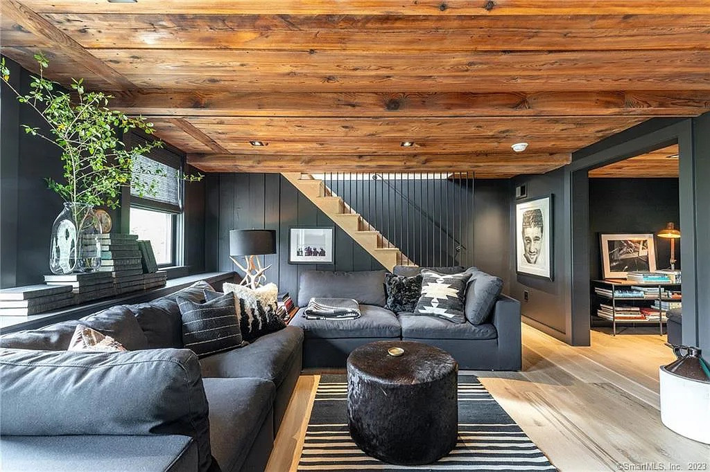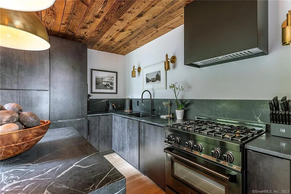 The location of this high-end cottage overlooks the center of New Preston Village. It has three bedrooms and two bathrooms, custom kitchen cabinetry, custom steel railng and loft ladder, and oak wide-plank floors. The primary bedroom offers a vaulted ceiling and classic marble and tile bath with a step-in shower. A stone path and tiered stone walls grace the property. Listed at $895,000 by William Pitt Julia B Fee Sotheby's International Realty.