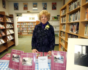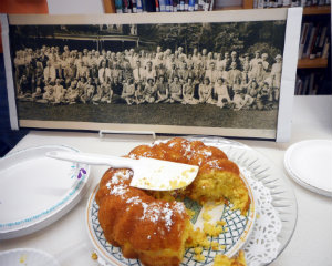 Pat Macias, who was on the cookbook committee, stands ready to sell cookbooks; A cake, whose recipe is included in the book, sits in front of an historical photo of Tilden Pharmaceuticals employees.