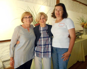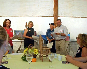 Lisa Green reports from New Milford. One of the things we most love about covering events is bearing witness to (and yes, being embraced by) the warmth and enthusiasm of the communities in the RI region. On Sunday, Sept. 24, that “we’re all in this together” spirit filled The Silo’s handsome, restored barn at Hunt Hill Farm. The brunch, catered by Bonni Manning, honored the farmers, artists, volunteers, boards and commissions who banded together to make Connecticut’s first barn quilt trail a reality. Now, eight giant painted quilt panels adorn eight barns, with each design reflecting the history of the farm and the town’s agricultural past. New Milford Mayor Dave Gronbach presented certificates of appreciation to the many participants, praising the project as the perfect intersection of art, landscape and community. In a fitting cap to the event, Rachel Carley, an expert on barns in Connecticut, spoke about the styles of the eight host barns on the New Milford Barn Quilt Trail. [Above, the Quilt Trail committee: Suzanne Von Holt, chair, with Julie Bailey and Susan Bailey (no relation), whose barn bears the first of the quilts to be hung.]