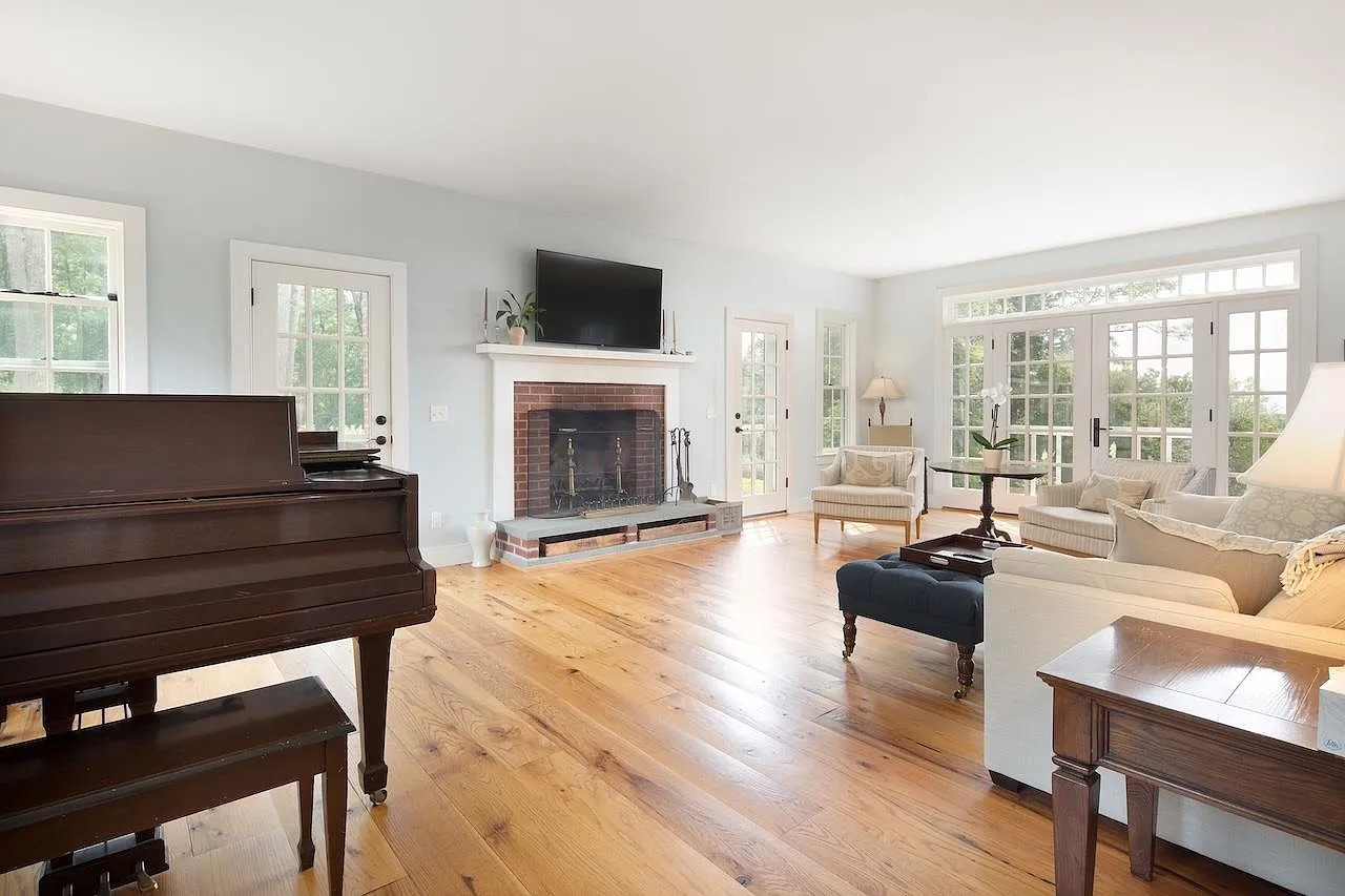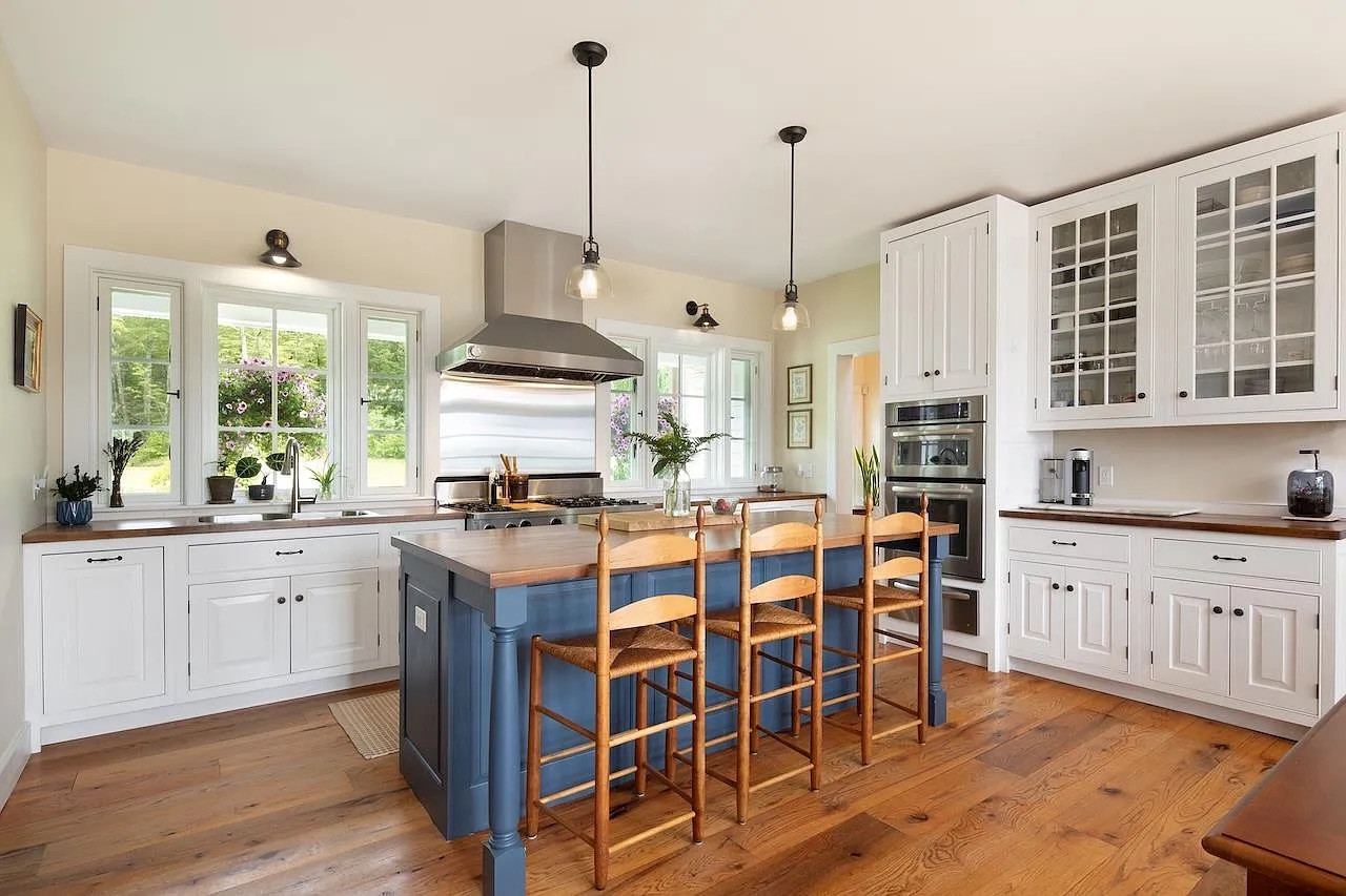 This home has three bedrooms and three bathrooms at 4,648 square feet. It calls back upon the history of farmhouses in this area, with wide red oak plank flooring, French doors, a wraparound porch and brick fireplace. But it also has tons of storage, an indoor pool, Viking appliances in the kitchen, and a spa master bathroom. The lower level even includes a wine room, workshop, and plumbing already in place for a steam room and/or additional bathroom.