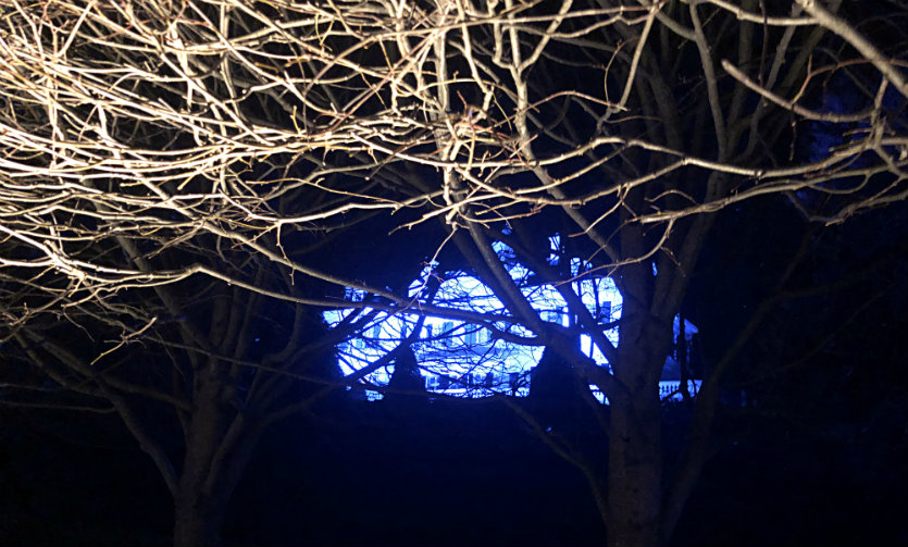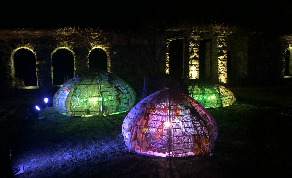 Other vignettes include wintry blue architectural sculptures evoking the geometry of both Wharton’s garden design and snowflakes; the illuminated lane of trees; a glade dotted with twinkly pods that you could swear were inhabited by woodland creatures. Hanson, the composer, created electronic soundscapes to pair with the mood in each of the settings.