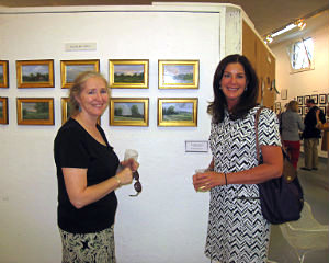 Madeline Falk, known for her animal portraits, branches out with her small landscapes, and talks to Linda Riiska;Tom Curran, who is in the auction and antiques business, admires Laura Lasker's work.