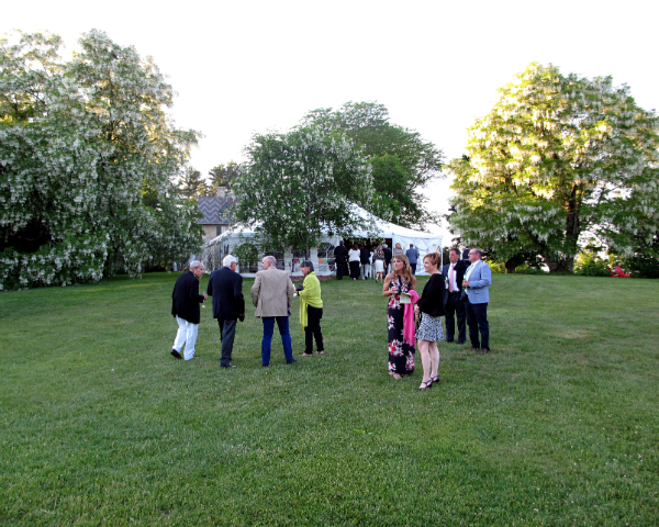 Guests make their way toward the tent for dinner on the Museum's grounds, whose trees were in full bloom.