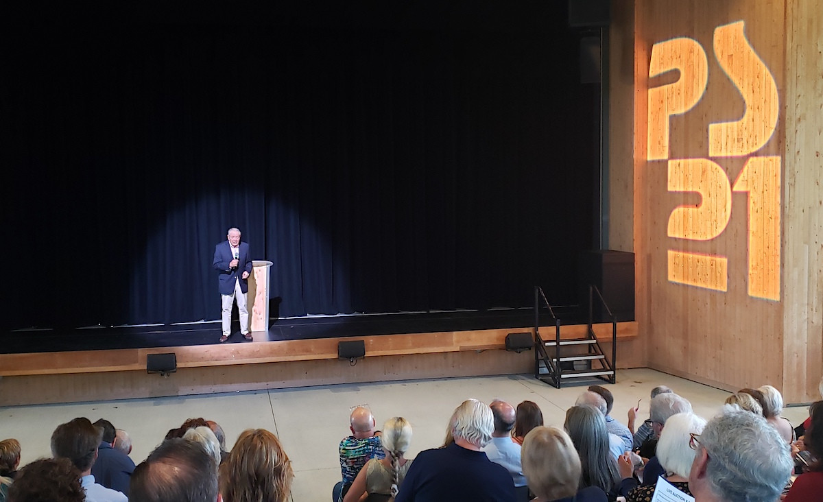 Matteline deVries-Dilling, founder of Lite Brite Neon, one of the evening's honoree of this year's Upstate Benefit adresses the gala from the Caboose's caboose.