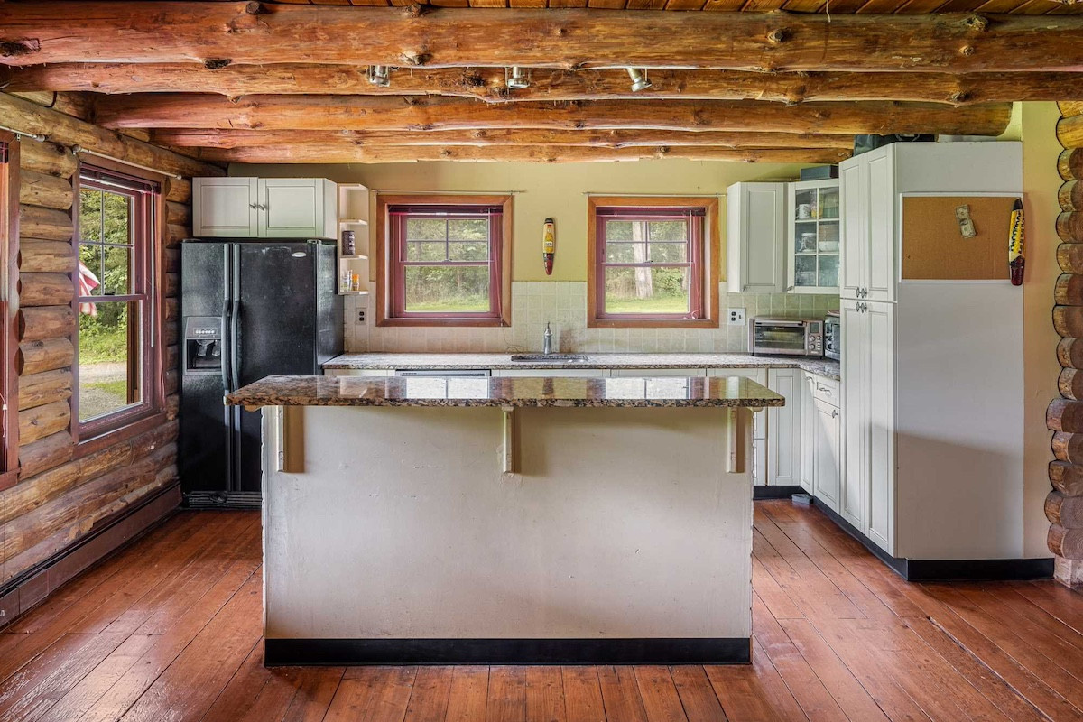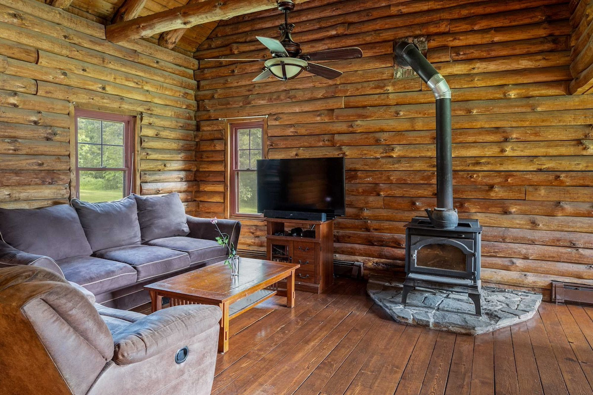 In Hyde Park, a log cabin home is set on 3.5 acres of evergreens, open lawns and stone walls.