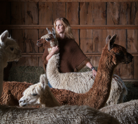 By Nichole Dupont We all remember them, the rough-as-bark, dun-colored sweaters so bulky so that they could make even Kate Moss look puffy. But we so wanted to like them because there was some revolutionary air about wearing a fat, itchy alpaca sweater. Fortunately, it doesn’t have to be that way any more. Alicia Adams has transformed the wiry fiber of the puffy animal into a vibrant, soft collection of capes, sweaters and even baby clothes. Adams is the official design arm of Alicia Adams Alpaca, Inc., a unique Millbrook, NY-based farm and textile business that specializes in the production and design of products made using fiber from Suri alpacas. “It all grew very organically; this whole thing,” Adams says. “It’s a learning by doing kind of thing. My husband Daniel returned from a trip to Australia — we were living in Munich at the time — and said we were going to breed alpacas. He was so excited. At that time, I honestly could barely knit. So it was a crazy idea.” That was 11 years and three children ago. The family of six, who started with 15 alpacas, now owns and operates the main farm of 40 or so alpacas. The other 160+ are raised at sister farms in California and Ohio. The farm in Millbrook is also home to a plethora of chickens and non-alpaca critters, and more often than not Adams’ children are in charge of the smaller tasks of egg gathering, naming the alpacas and making sure their "baby" sister (now two and a half) is doted on. And during trade show season, her eldest daughter, who is 14, is often at Adams’ side, lugging sweaters and talking up potential retailers. “This is a 365-day, 24 hours a day job,” Adams says, laughing a little. “I am busy all the time. This is an adventure and we just do it. We don’t complain. I don’t really think about my to-do list. I’m happy that our children know we work and see us working.”