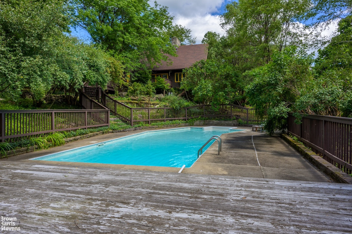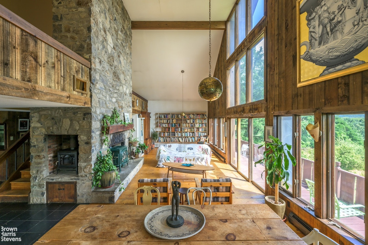 Oak Hill Lodge is a one-of-a-kind sanctuary with 25-foot ceilings and views that overlook the mountains. The 20-acre property in Copake includes a pool, meadows, and mature landscaping. The 70s modernist home has three bedrooms and three bathrooms, an 80-ton, three-story stone chimney for three fireplaces, expansive windows to appreciate the view, a wine cellar and pool. Listed at $2,550,000 by Brown Harris Stevens.