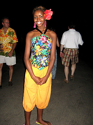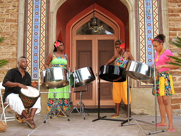 "I'll have a Dark & Stormy, please," one guest requested of the bartender, seemingly unaware of how portentous her cocktail order might be. But, as it usually does, the weather cooperated on Saturday, July 24, for Olana's annual (rain or shine) summer garden party. This year's theme, Paradise Found, refers to the many months in 1865, that Hudson River School painter Frederic Church and his wife Isabel spent in Jamaica. (This trip was at least two years before Olana, their Persian-style house overlooking the Hudson River, was so much as a gleam in the artist's eye.) Hence, "island attire" was encouraged. Many male guests interpreted that broadly and wore Hawaiian shirts, while the women seemed to favor anything cool and bright. However, it was the musicians, Hamilton Hill Arts Center Steel Drum Band (single lead steel drummer Jasmine Kendricks, left), who nailed "the look." For future reference, gentlemen, remember clam-diggers? Ladies: if you start with a hibiscus in your hair and work your way logically down from there, you can't go wrong.