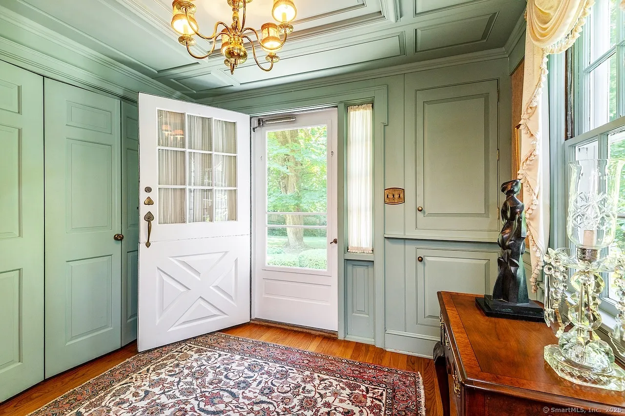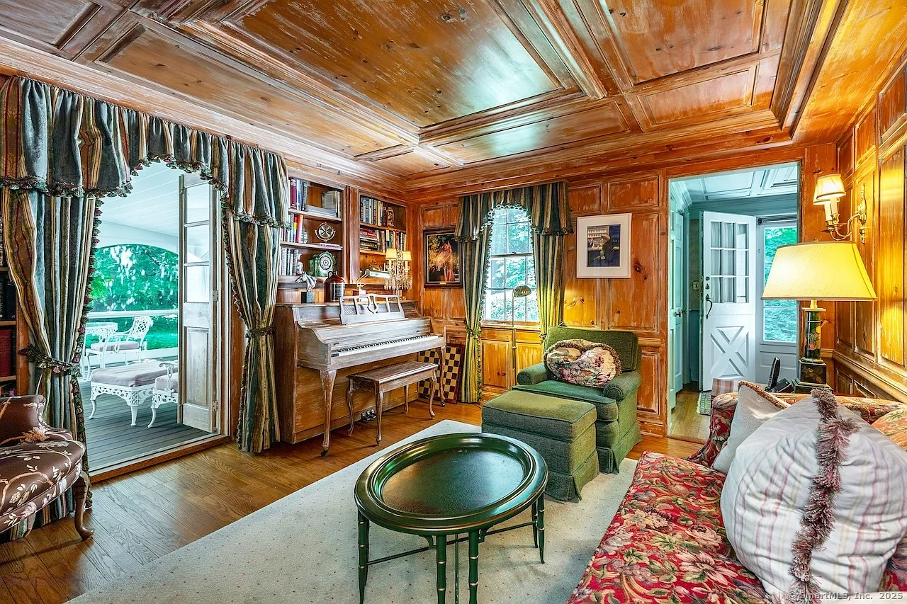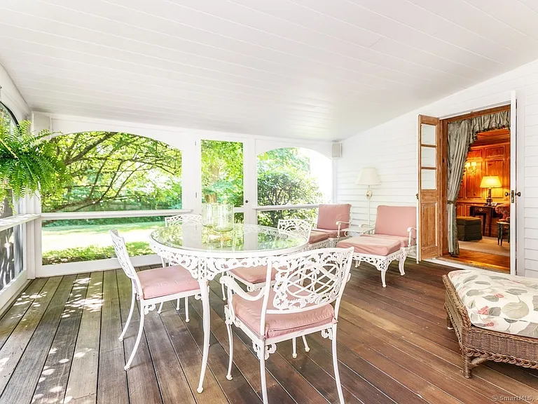 This is a 1930 home with classical touches and original, luxurious wood paneling. Sunlight streams through large windows, illuminating the finely crafted details throughout. The main floor features a stunning primary bedroom suite with French doors leading to a screened-in porch, offering a private escape with views of the surrounding gardens, a feature of all fine houses in the Litchfield hills.