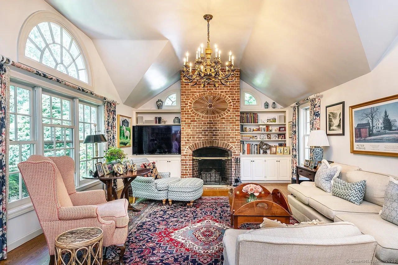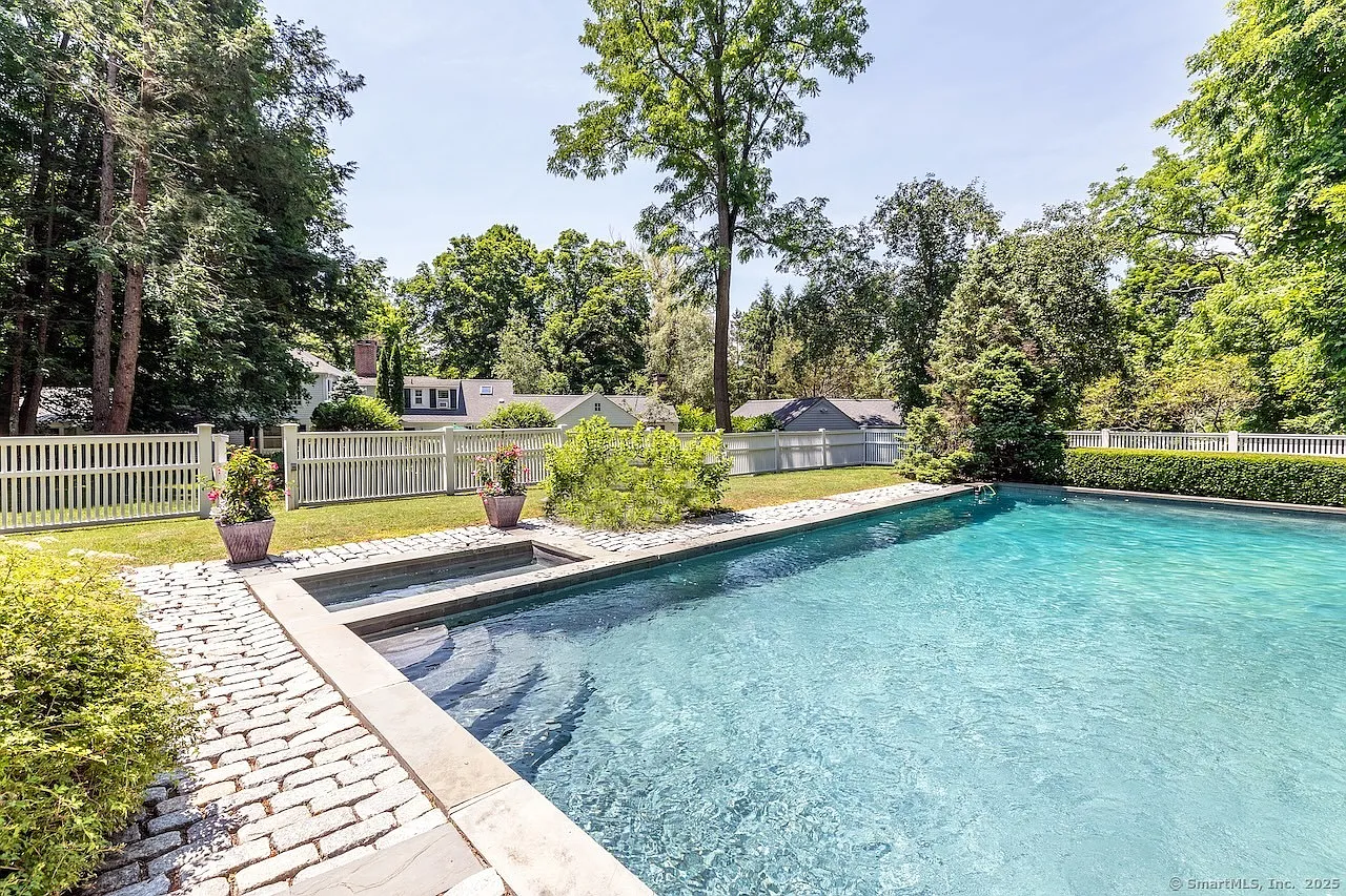 This is a refined home with formal living and dining rooms, as well as its own library space. The open-concept kitchen seamlessly connects to the family room, where cathedral ceilings, built-in bookcases, and a fireplace create a welcoming atmosphere for gatherings. There's even an additional one-bedroom guest house on the property so you can welcome friends into their own private retreat. Maybe you can both meet at the heated pool, then share drinks on the immaculate brick-and-stone terrace.