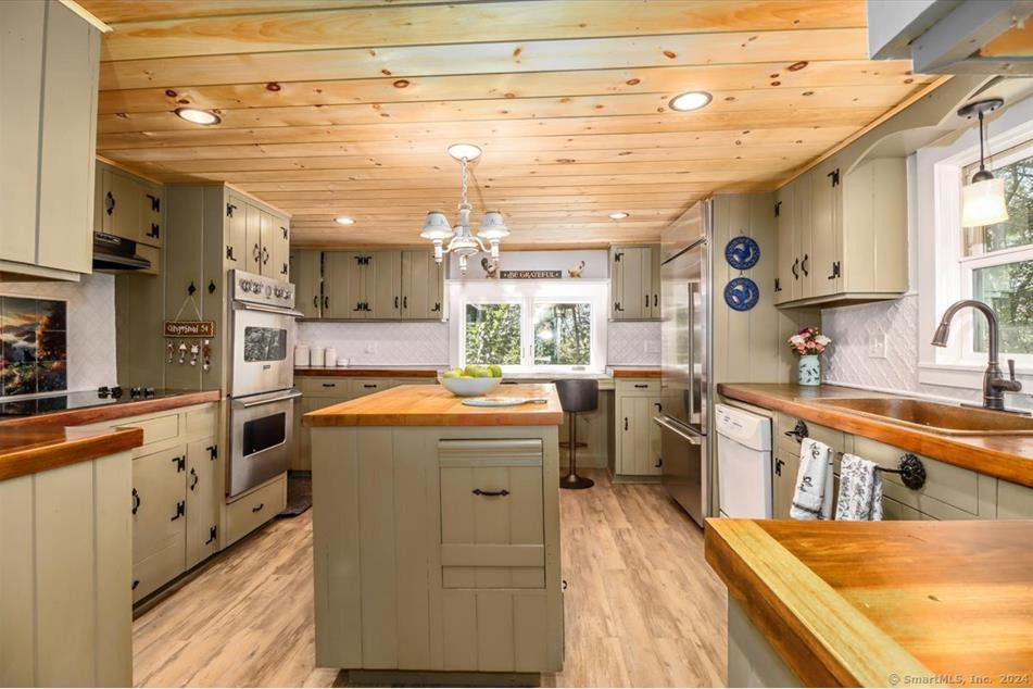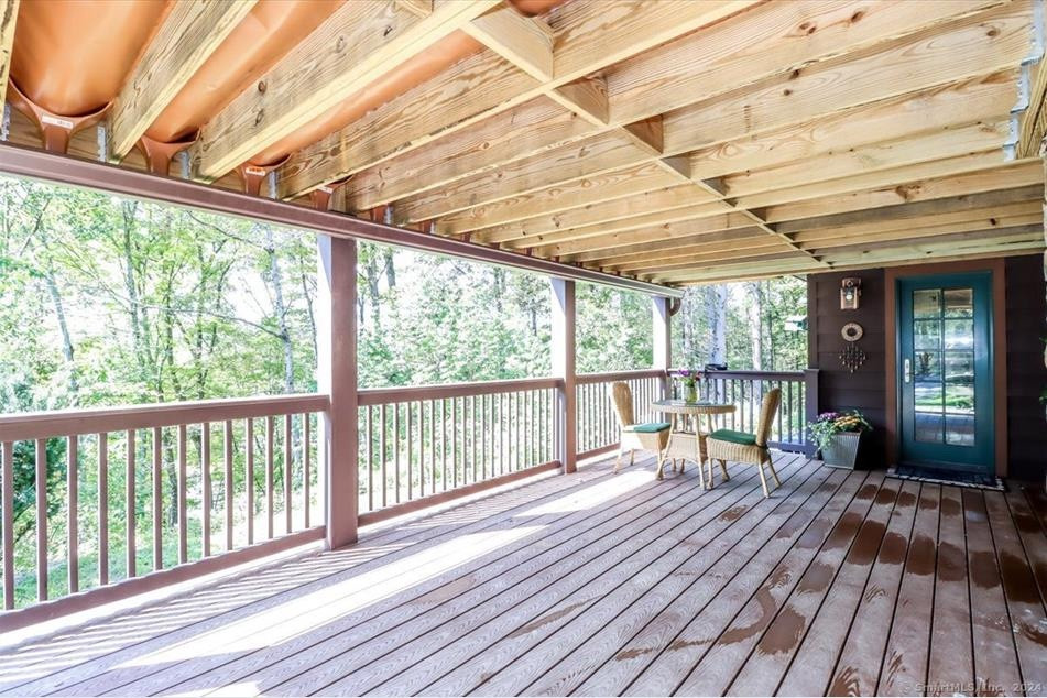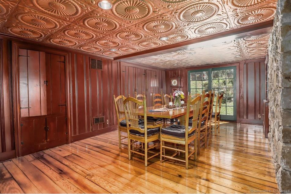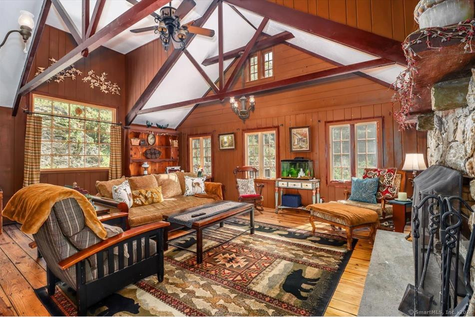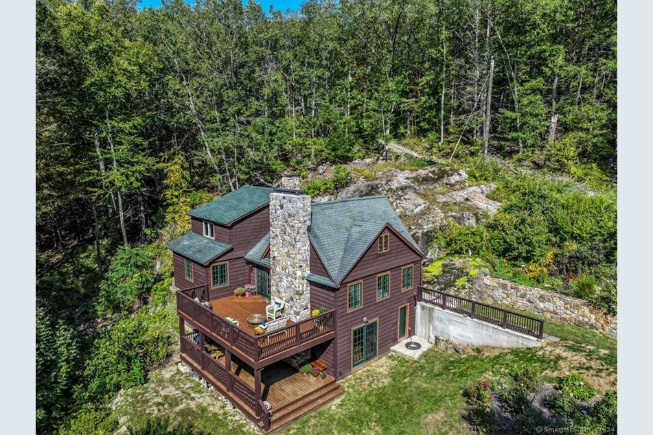 Sited on an unpaved country road, this Colonial in Gaylordsville offers 2,288 square feet with three bedrooms and three bathrooms. It has vaulted ceilings, two stone fireplaces, numerous built-ins, hardwood floors, a balcony/deck, all surrounded by a serene setting. Listed at $599,000 by Coldwell Banker Realty.