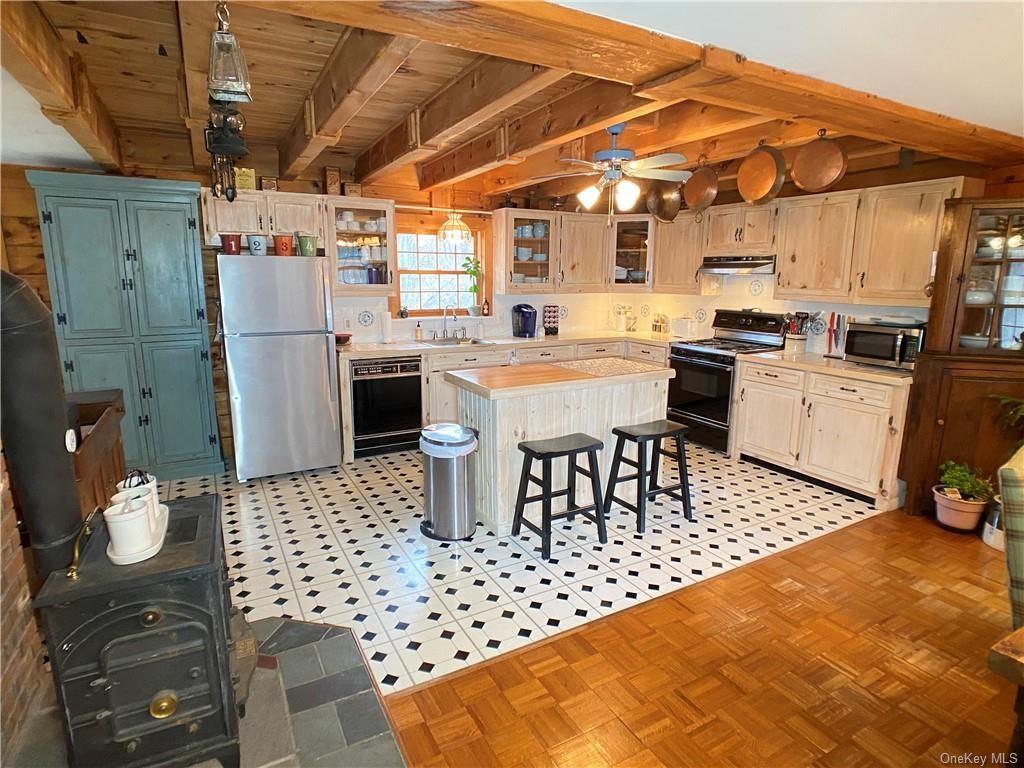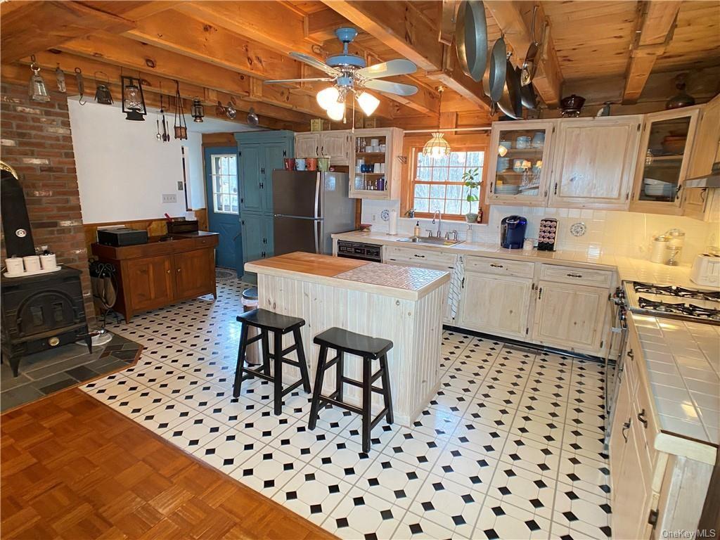 Situated on almost six acres in Pine Plains, this log ranch home has three bedrooms and two bathrooms. It features a large open floor plan and the spacious country-style kitchen offers a beamed ceiling and modern tile. There is both a front porch and a large wraparound deck. Listed at $425,000 by Keller Williams Realty Partners.
