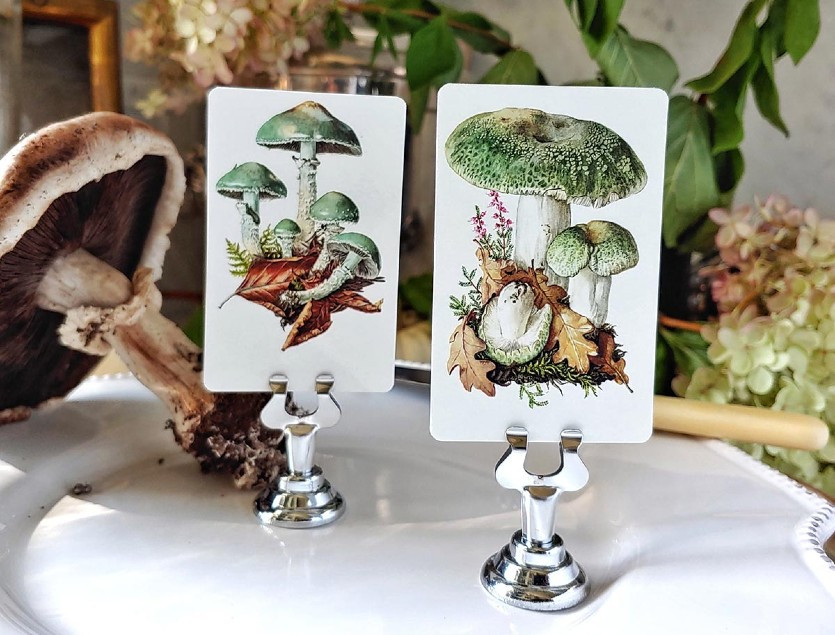 The Coopers manufacture all of the paper products — place cards, notecards, and collateral such as menu cards, table numbers and invitations — on four digital presses at their home studio. Birds, botanicals, nudes, silhouette portraits and holiday themes are some of the images that reflect the couple’s ephemera gathered over the years.