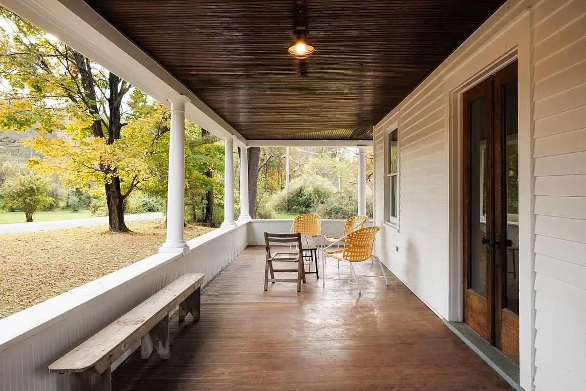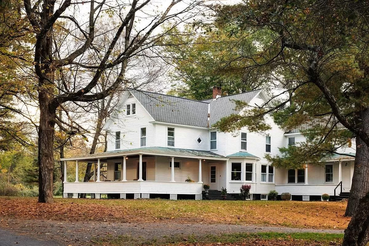 Located on 15 acres of historic Hudson Valley farm land between Hudson and Chatham, a 19th-century farmhouse welcomes with a covered wraparound porch. Inside are original, unpainted wood moldings and oak floorboards, pocket doors, beveled glass doors and a side-hall staircase. There are five bedrooms and three bathrooms. A small cottage, three-car garage and swimming pool complete the property. Listed at $1,250,000 by Four Season's Sotheby's International Realty.