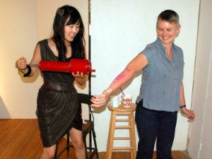 Stefan Friedemann and Laura Lapachin, owners of the Hudson gallery Ornamentum, like to cross the line—not only between serious art and wearable jewelry but also between the conscious and unconscious mind. A recent controversial display of taxidermy rabbit heads, ears stuffed with jewels, was a provocative surrealist display worthy of Man Ray or Salvador Dali. In the current exhibition, A Series of Dreams, artist Dan Jocz's (left) semi-conscious ruminations, many about his muse Marlene Dietrich, are the theme. On display were bracelets with cherries and lipstick-stained fag ends (presumably Marlene's) molded from enameled copper; nickel and silver cube rings, and brightly colored symbols flocked with rayon dust fibers. According to RI's Scott Baldinger, the opening receptions was as casual and warm as the summer evening. So easygoing, in fact, that many of the partygoers were willing to get flocked themselves.
