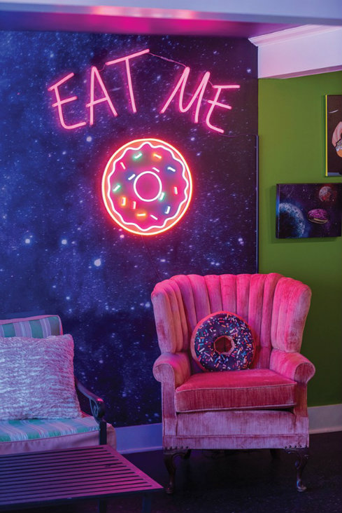 The results are impressive. The couple completely transformed an old storefront into a fun and wacky standout locale, one they hope will help bring new life into the village of Kinderhook. The newly reconstructed venue now boasts bright neon colors that glow under black lights; funky artwork featuring iconic characters indulging in donuts (like Homer Simpson, Garfield, and Banksy); and a cozy lounge with comfy chairs, fluffy throw pillows, and a galaxy wall where you can Instagram your loved ones (or self) under a bright neon sign reading "EAT ME."