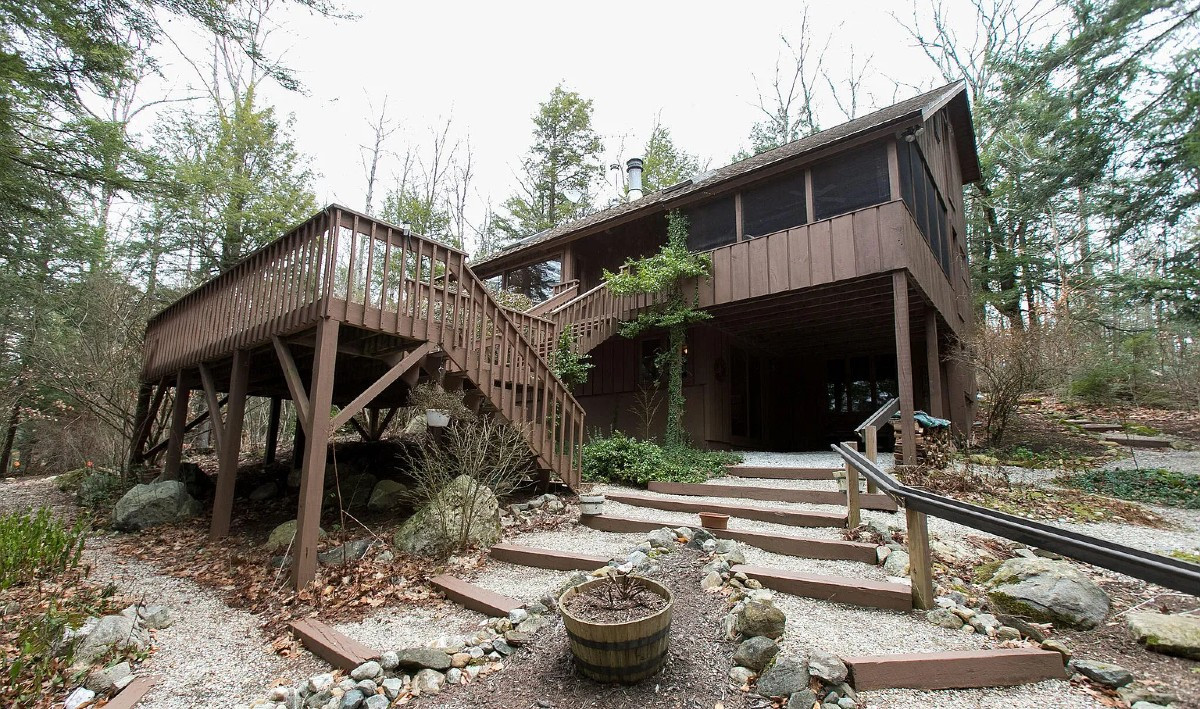 A Contemporary home with loft space and several levels in Sandisfield offers three bedrooms and three bathrooms. There is an updated kitchen, living room with fireplace, dining area next to screened-in porch, and a lower-level family room. Decks on various levels provide extra entertaining spaces. Association amenities include pool, tennis/pickleball courts, and beach rights. Listed at $599,000 by Lance Vermeulen Real Estate.