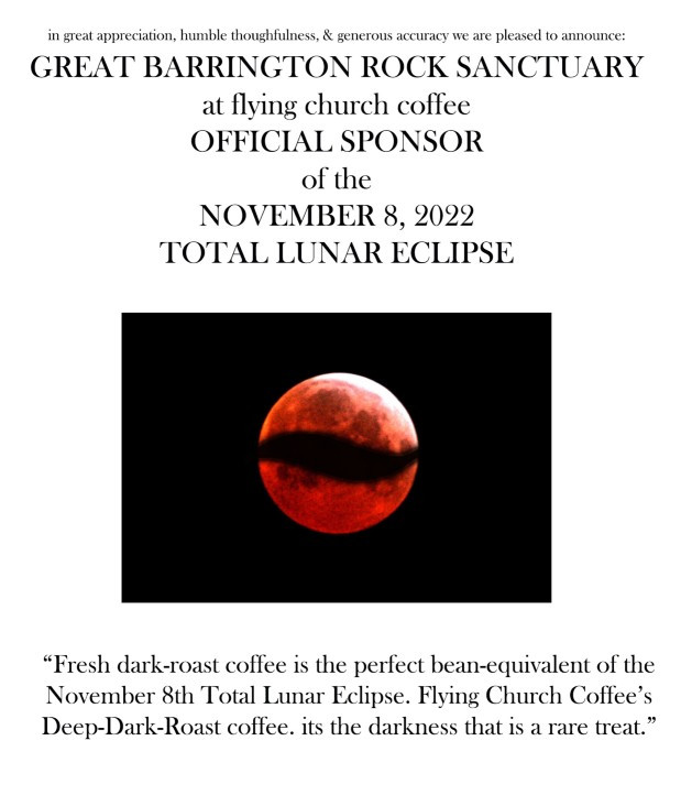 But for now, java is Joffe's full-time thing, and you’ll find him happily serving, greeting customers, and singing the praises of his staff and his tenants. (Check out the acknowledgements on the website: a thank you to every person who was involved in constructing the Flying Church and Flying Church coffee.) He's also scheduling special events now and again. Put this on your calendar: the Great Barrington Rock Sanctuary is the Official Sponsor of the November 8, 2022 total lunar eclipse. Joffe says there will be a special deep, dark roast coffee in recognition of the darkness of the eclipse.
