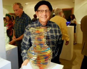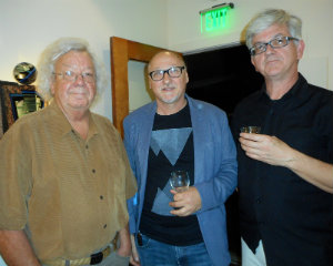Glass artist Eric Hilton and Ed Yasuna; Sidney Hutterer stands by one of his magnificent pieces.