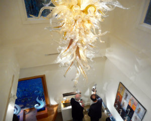 Lisa Green reports from Stockbridge. It would not be an overstatement to say that I was gobsmacked by the virtuosity of the glass artists represented at the Schantz Galleries, but even the collectors among the crowd expressed wonderment for the pieces on display. Jim Schantz and his team invited a select audience to a reception to view "Cast, Cut and Cold" on Saturday, Oct. 7, at which several of the exhibiting artists were present. “Come help us celebrate the art, the artists, and the beautiful autumn colors of New England,” read the invitation, but clearly, the works by these internationally recognized glass artists, some of the best known in the world, were the real stars of the weekend. Following the reception, guests strolled around the block to the Red Lion Inn, where Jim Schantz and Kim Saul hosted a dinner for the art glass community — of which I now proudly call myself one. Above, a piece by Dale Chihuly hovers over the main floor exhibition area.