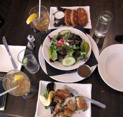 From top: Sauteed falafel, Greek salad, and spanikopita that the author couldn't wait to eat.
