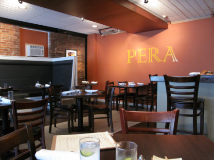 And, more importantly, so is the food. I've always been a fan of spanikopita, and Pera's Executive Chef Randall Beaudoin does it well — a deliciously flaky appetizer with just the right spinach-to-feta ratio. Falafel, too, has always been a favorite, but until I had it at Pera I had absolutely no idea what I was missing. Falafel usually comes round and deep-fried, but Pera's appetizer ($8) is flat, sautéed in olive oil and served with cusabi dipping sauce (a creamy concoction made with cucumbers and wasabi). Consider me a falafel snob from now on. In fact, nothing on Pera's menu is fried; the lamb for the lamb burger ($10, with arugula, feta cheese, and cusabi dressing) is ground fresh daily; the menu includes seasonal offerings like a summer watermelon salad; and the popular mussels appetizer changes flavors daily. Dinner ($15-$29) is a mix of American and Mediterranean dishes, and includes the popular Calamari Fra Diablo, Mediterranean scrod, and chicken or lamb kebabs. Save room for dessert ($6-$7), though, because they've got amazing baklava, gelato from SoCo Creamery as well as flourless chocolate cake and Irish whiskey cake from Crazy Russian Girls Neighborhood Bakery located right over the border in Bennington. Karakaya and Beaudoin excel at their goal of serving quality food at affordable prices. And locals appreciate it, evidenced by a packed house at lunch and dinner times. Outside tables are available, but the inside, with its warm colors, elegant dark wood tables and nighttime candlelight, might be even better. Pera Mediterranean Bistro60 Spring Street, Williamstown, MA (413) 458-8676 Open Sunday -- Wednesday from 11 a.m.-9 p.m. Thursday, Friday & Saturday from 11 a.m.-10 p.m.