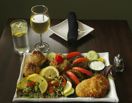 The Pera Sampler ($15) includes hummus, tabouli, grape leaves, falafel and smoky grilled eggplant puree. Photo by Ralph Hammann.
