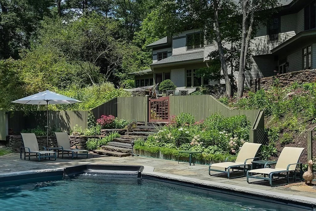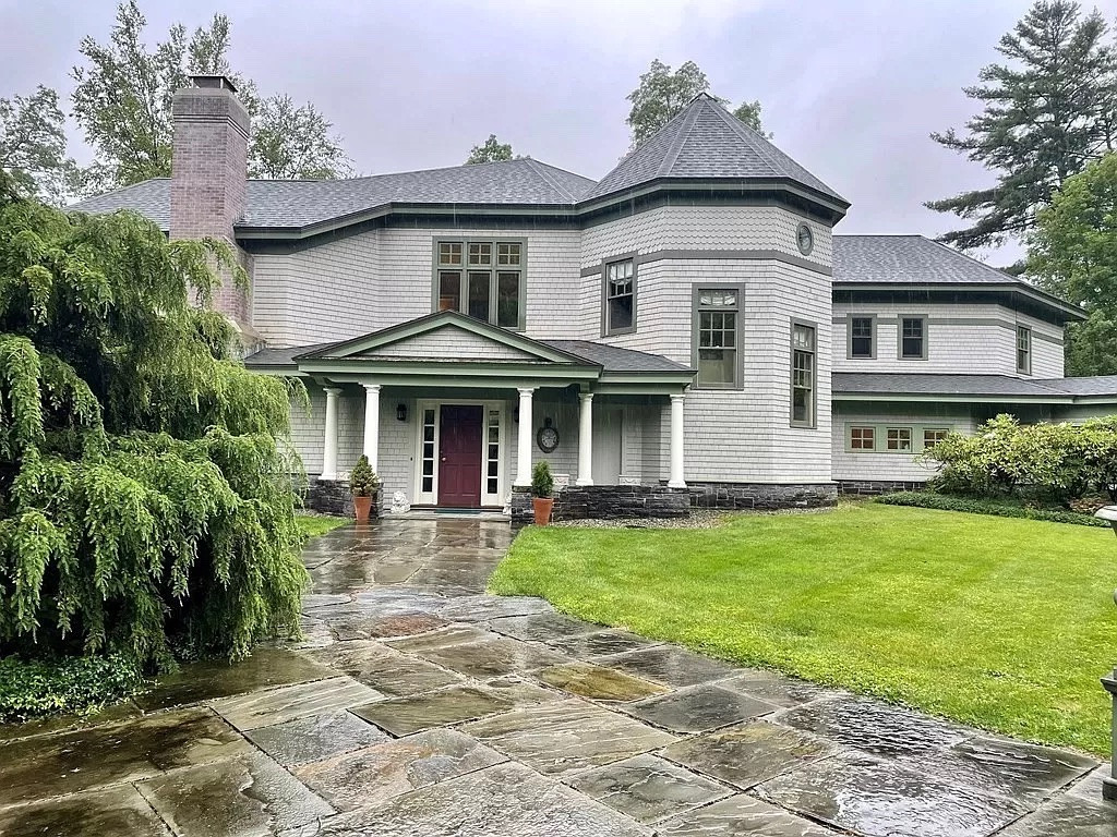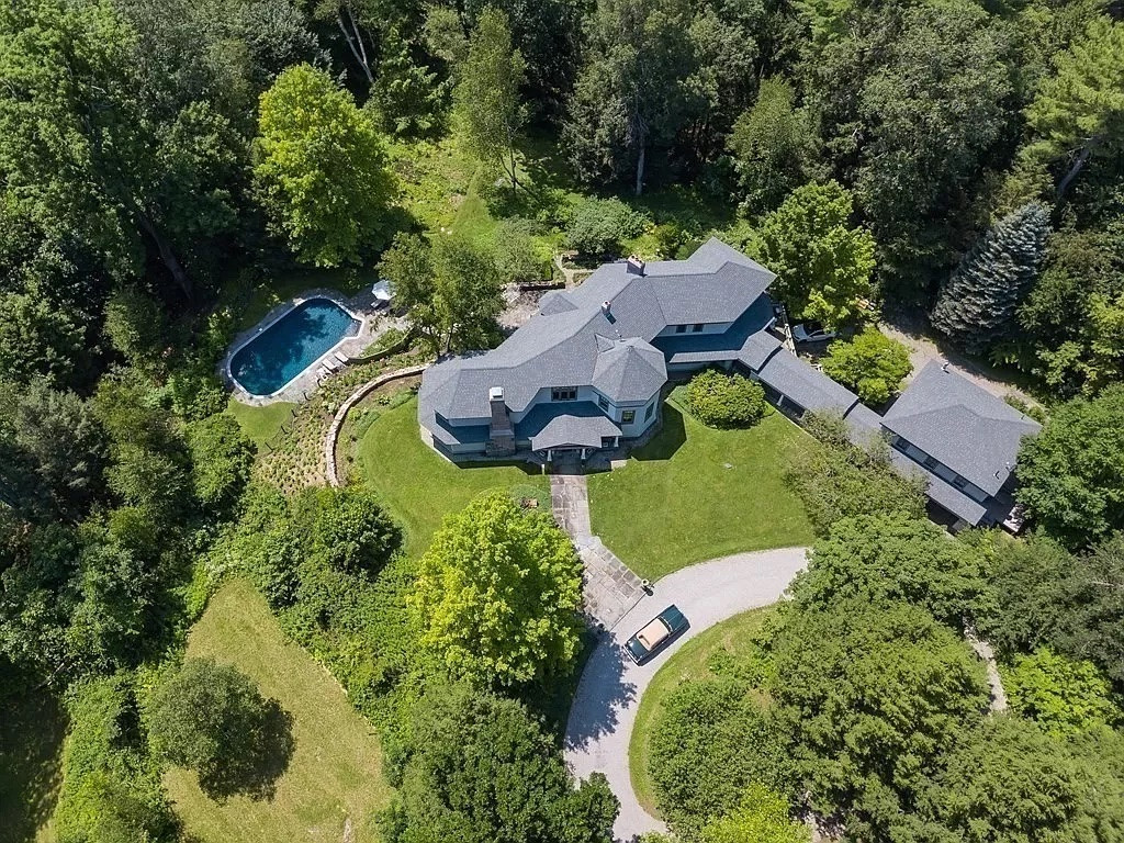 The main house of this Stockbrdige estate has five bedrooms and five bathrooms, a two-story foyer, grand living room and library. There is a farmhouse-style kitchen and dining room with fireplace, butler's pantry, wine cellar and lots of outdoor space overlooking the landscape. Other amenities include a guest house and pool. Listed at $2,595,000 by Berkshire Hathaway HomeServices Barnbrook Realty.