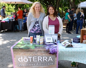 Debra Bartlett and Gabriela Montenegro behind their booth for doTerra Wellness Advocate; Peter and Brittany Destler representing their family's shop, A New Leaf Used Books.