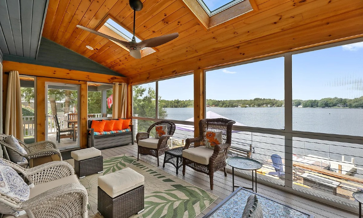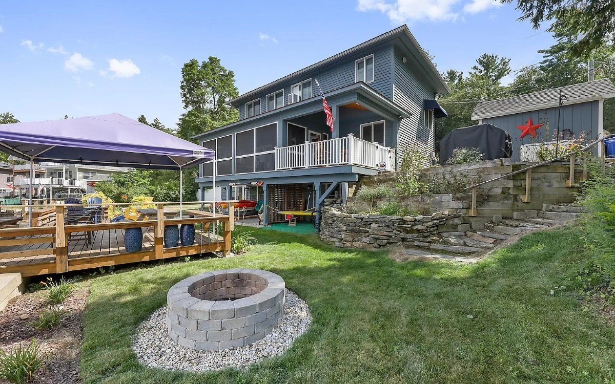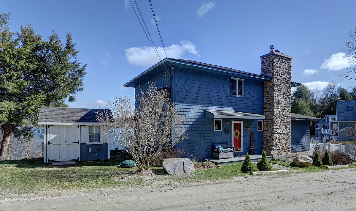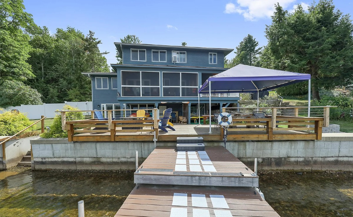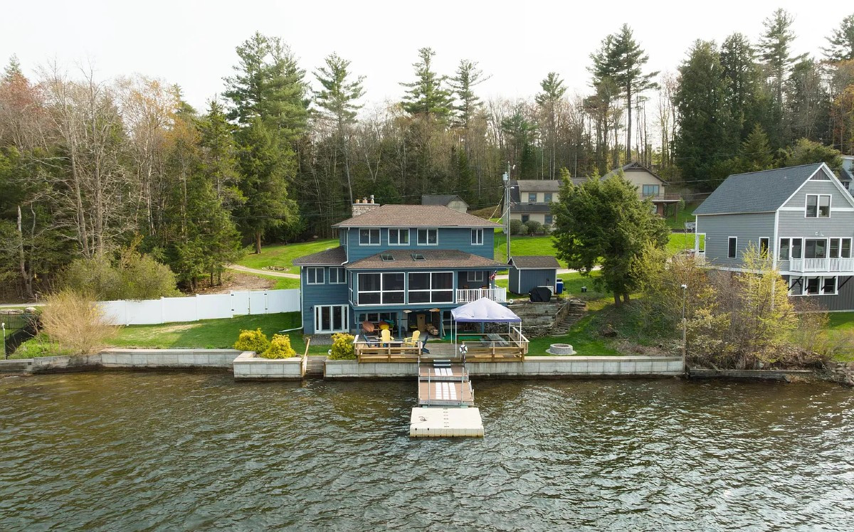 A three-bedroom, three bathroom home offers frontage on Plunkett Lake in Hinsdale. The kitchen has granite counterops and stainless appliances with an induction range. The spacious primary ensuite features a sitting area and three closets. Outside there is an oversized deck and a fire pit, plus a dock. Listed at $789,000 by Home Sweet Home Realty.