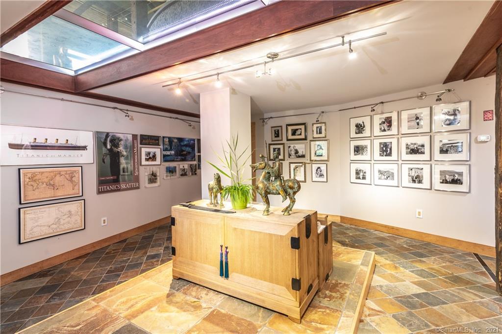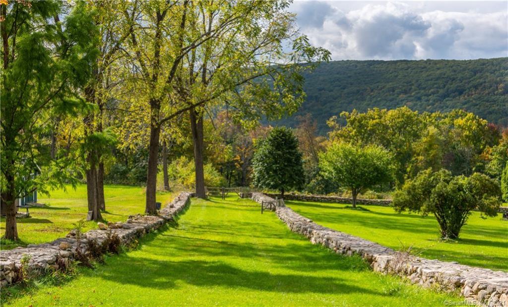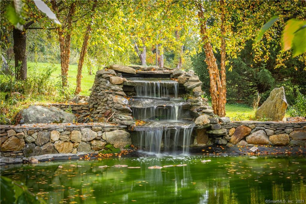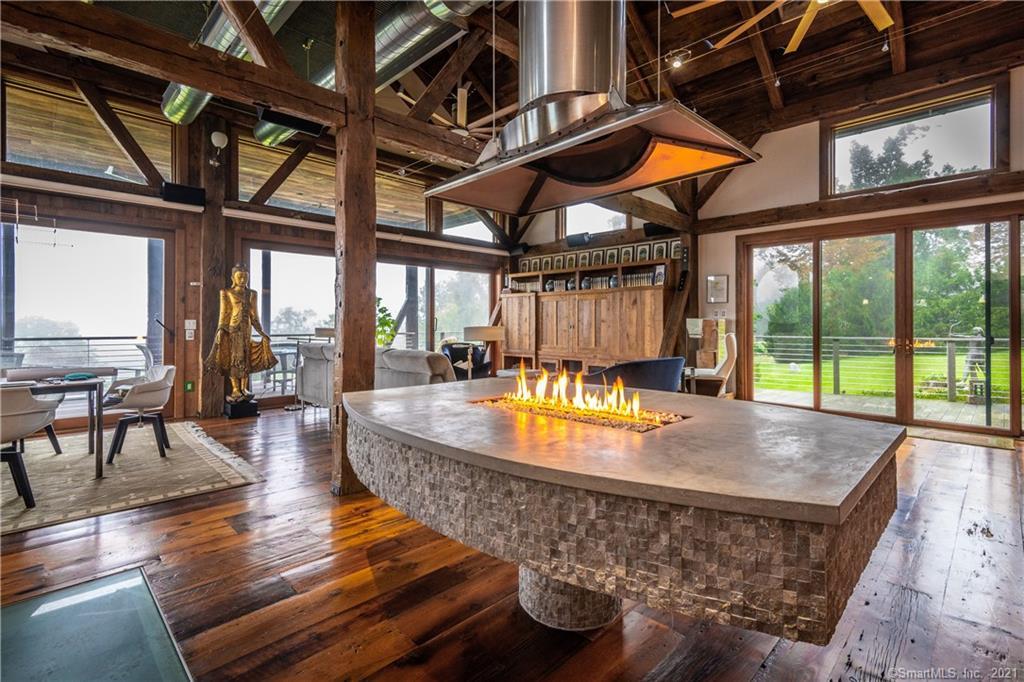 Pond Meadows Farm in Kent is nestled on 28 acres with mountain views. It's a combination antique farmhouse and barn, with three bedrooms and four bathrooms. A glass elevator is the entry to the main and second floors. There is a 31-foot great room, a metal catwalk that spans the space, and a private den. Outside features include a gazebo and pond with a waterfall. Listed at $3,000,000 by Bain Real Estate.