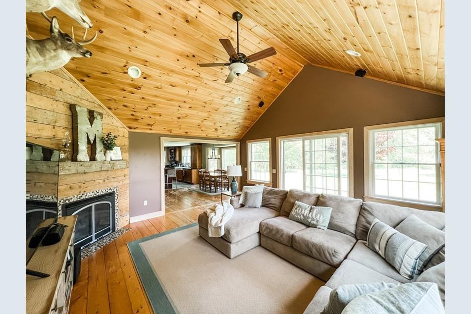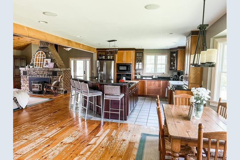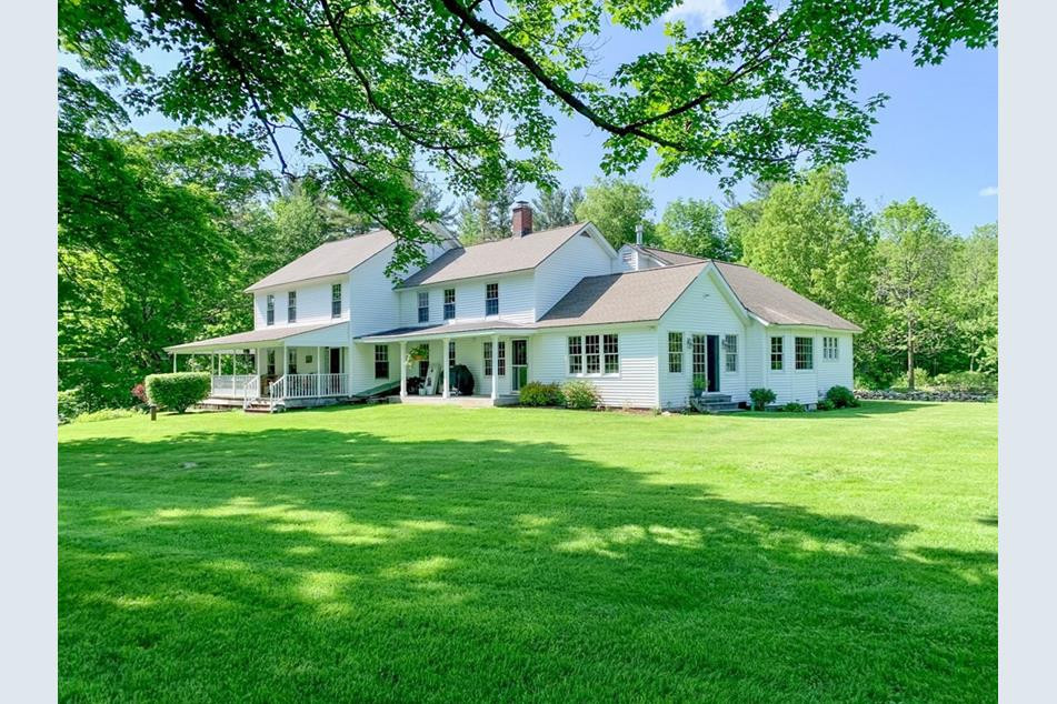 Situated on seven acres in Hinsdale, this Colonial farmhouse was built in 1890 but has been completely updated. It has five bedrooms (two are primary) and four bathrooms, a grand foyer, a finished basement, two-car garage, a shed, and that 70-foot porch on which you can admire the views. Listed at $795,000 by Berkshire Reciprocal.