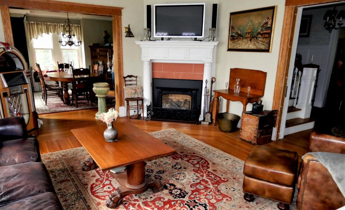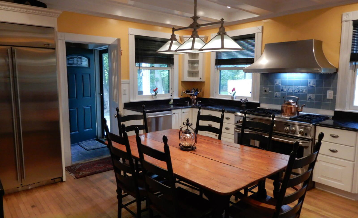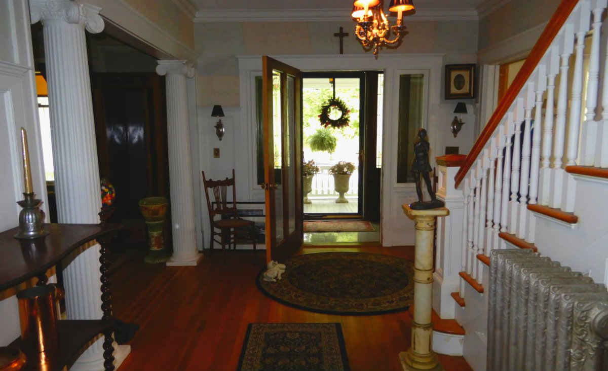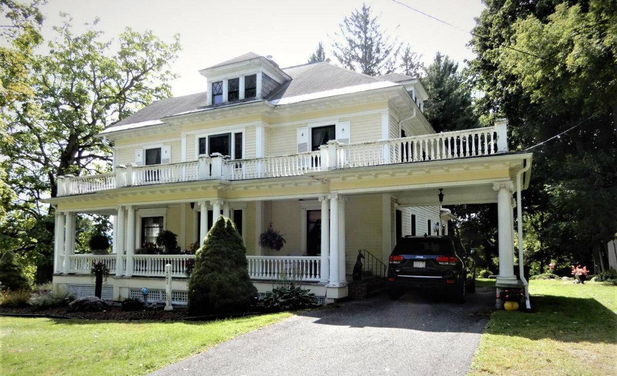 An antique cental hall Colonial first greets with an inviting front porch. The house has five bedrooms and two-and-a-half bathrooms. The eat-in kitchen features grantite countertoops, stainless steel appliances, and a butler's pantry. There are fireplaces in the dining room, family room and master bedroom. The walkup attic offers additional bedrooms. Listed at $339,000 by Real Living Realty Professionals.
