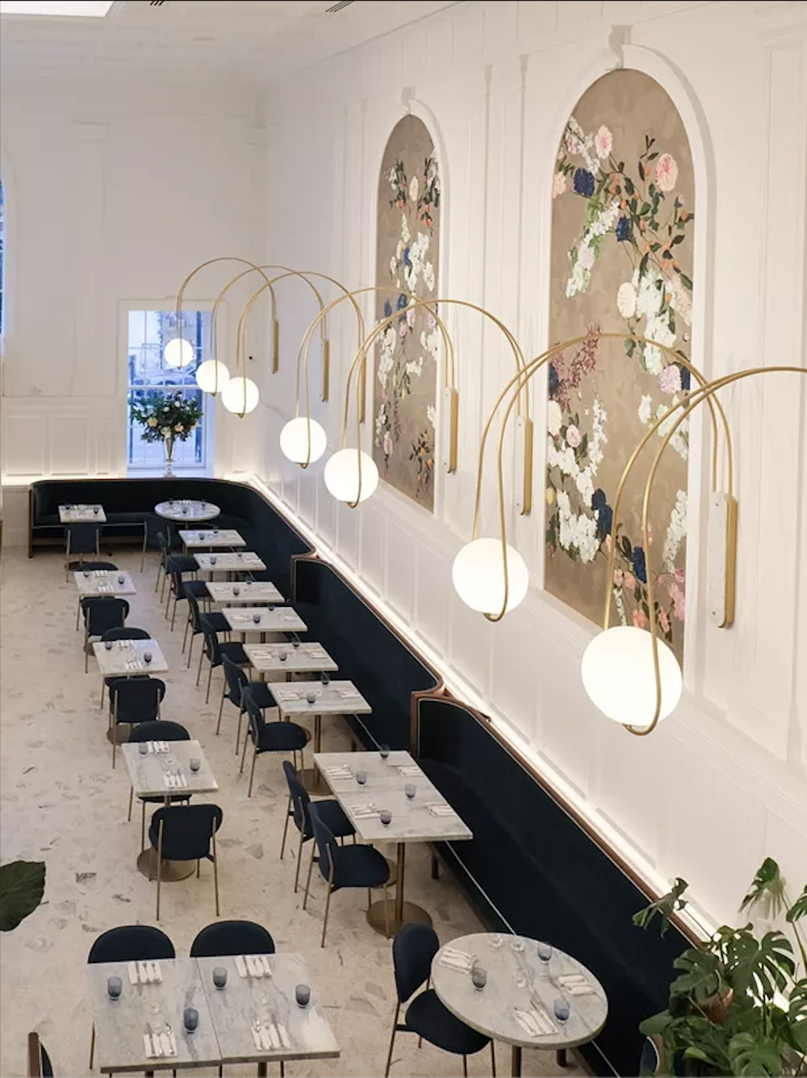 The result is soft but not overly feminine; bright and spacious yet warm and enveloping. Large arched windows let in ample natural light over an expanse of marble terrazzo floors. Deep blue velvet banquette seating along one wall cozies up to pale blue marble bistro tables; a handful of additional bistro and high-top tables are spread around. The opposite wall, which had been a teller line, showcases fresh-baked pastry and a selection of bonbons on a white marble display counter. Overhead, large arched wall lighting with brushed golden arms and translucent glass globes offer soft lines that take up space to quell the vastness of massive coffered ceilings.