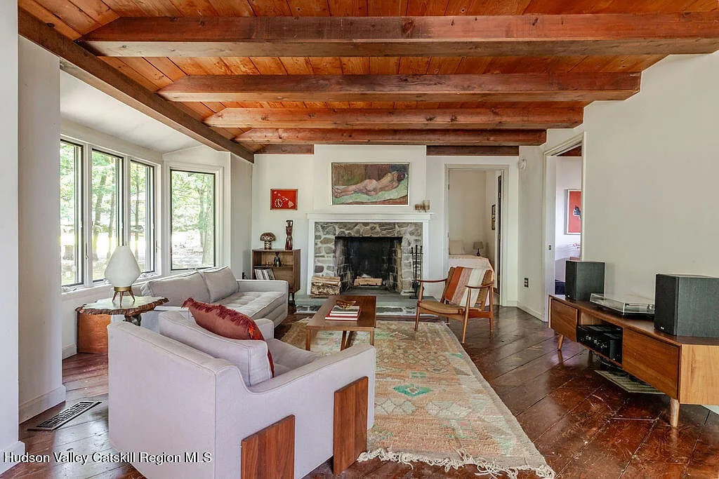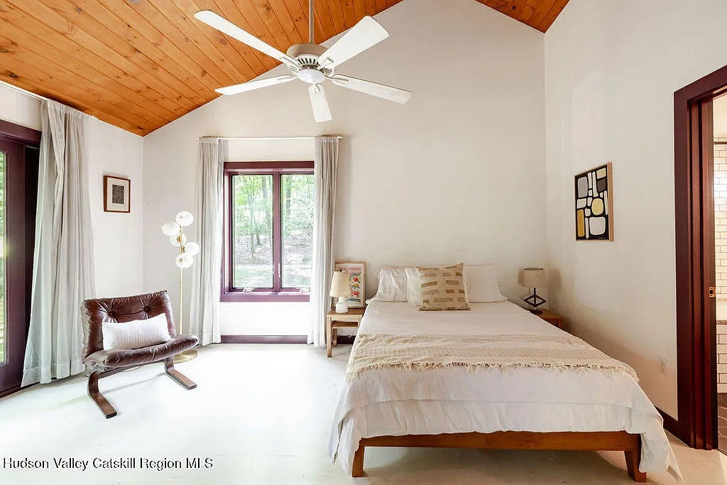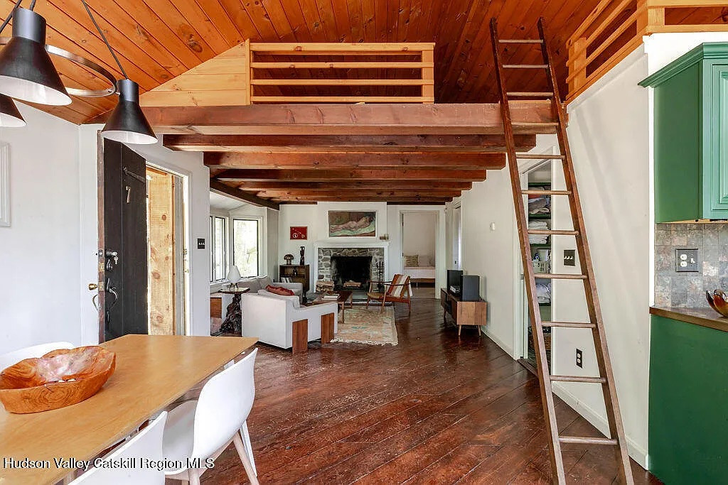 Built in 1960 with a 2017 addition, the interior has an updated kitchen with cool copper counters, a fieldstone fireplace, vaulted ceilings with nice thick beams, and direct access to the back deck from the primary bedroom. The dock on the lake is already in place, and there’s a grilling station on the stone patio. The house also has central air and forced air heating. Cozy lakehouse character highlights include a lofted space with a ladder, a fireplace in the main bedroom, and lofty windows that look recently updated.