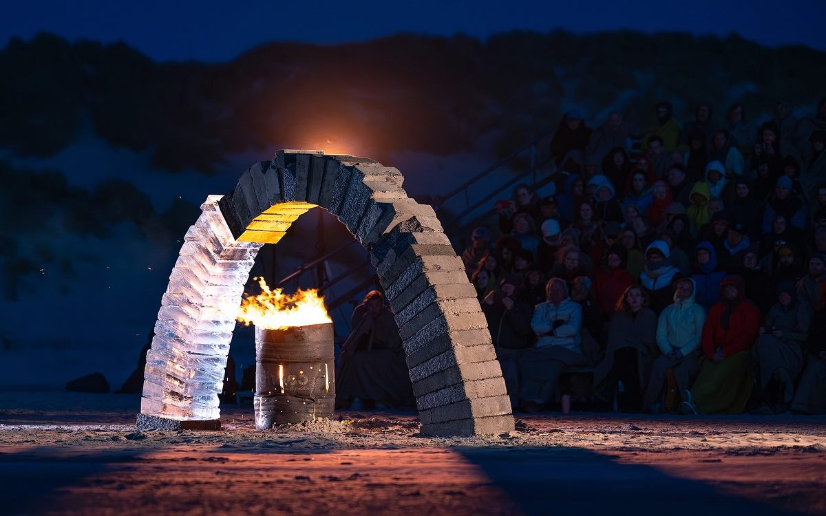 After dark, the tone shifts with the arrival of “Arch,” a performance-installation by UK-based company Kaleider. Somewhere between an opera and a construction project, the piece unfolds as performers attempt to build a free-standing arch from concrete blocks and ice. It’s an intentionally impermanent structure, melting and crumbling as it’s assembled, and a striking visual metaphor for shared labor, ambition, and futility. Kaleider has described the work as an “opera of inevitability,” where music and movement meet engineering and entropy.
