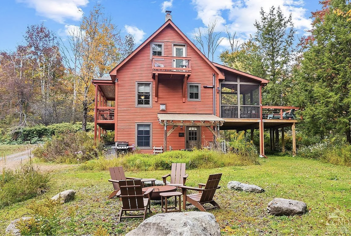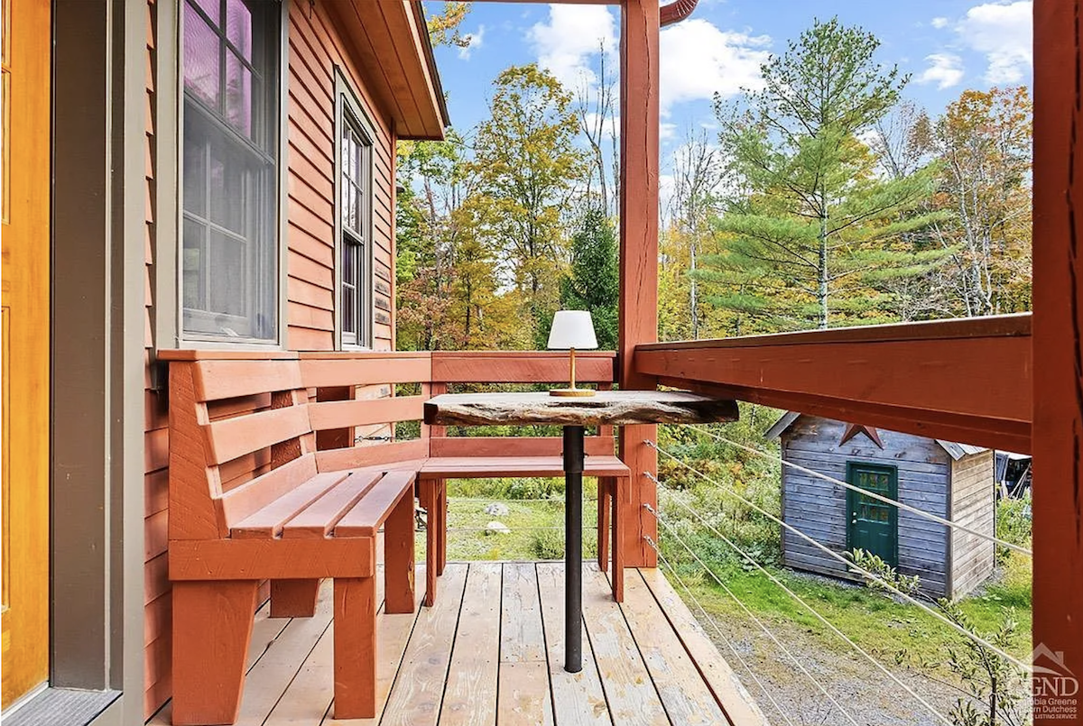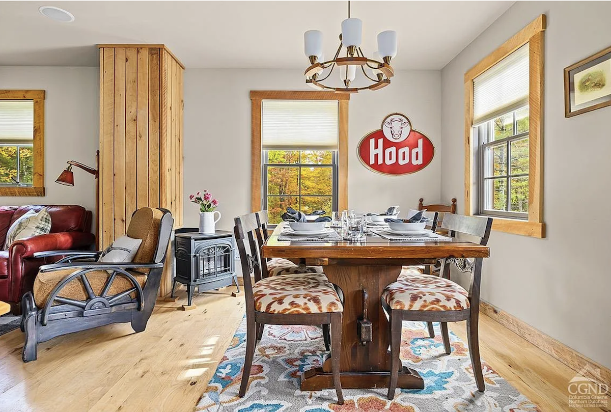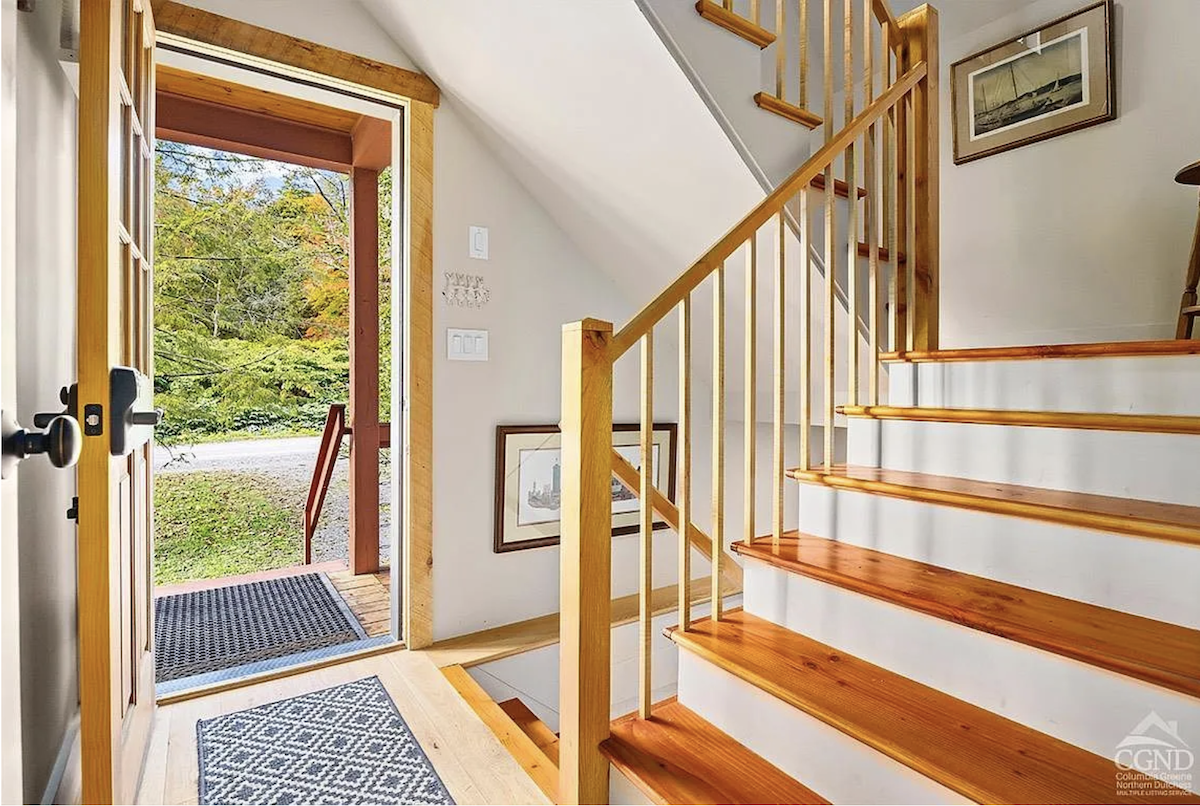 The property is quiet and wooded, with a deck overlooking the landscape. Though in a rural setting, the house is a short drive from Hudson and Great Barrington.
