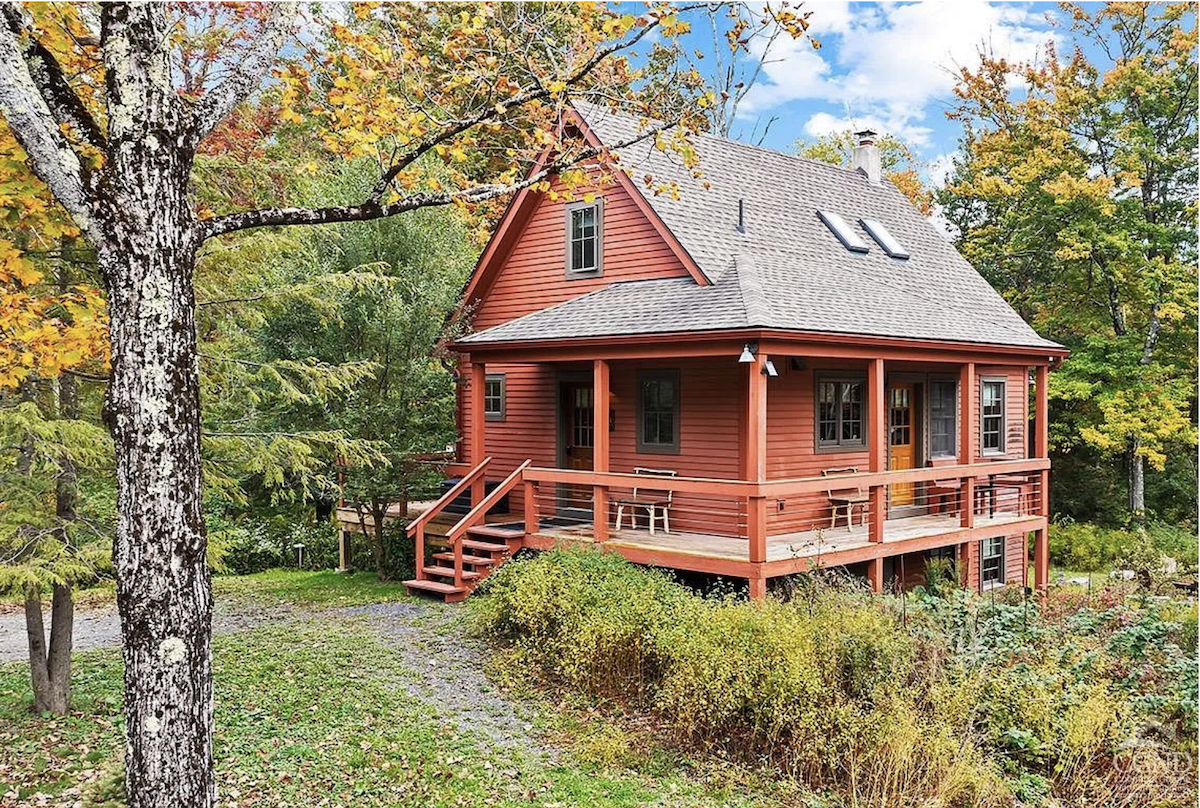 This little red cottage with a skylight filed pitched roof full and a covered wraparound porch has vacation vibes. Set on a sloped lot with a gravel driveway, the house is surrounded by trees and shrubs and forest.