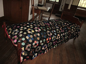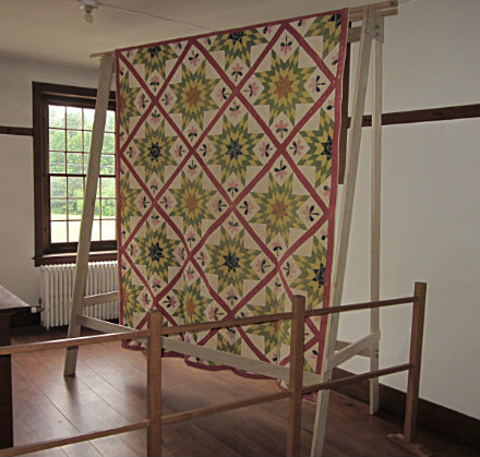 "It was a challenge to review the group of 70 quilts and get it down to 25," says Browne. "We chose the quilts in the best condition and grouped them by visual interest." There are seven quilts with a garden theme, for example, including those that follow classic patterns like the Cactus Rose, Honeycomb, Flower Basket and Kentucky Rose. In the community quilt category, a nine-block appliqued quilt from the 1850s called the Whig Rose or Democrat Rose, conveys its maker's political bent. It is joined by a handful of classic "community" patterns, including the friendship album and old-fashioned star patterns — quilts made by many hands to serve a community need, as, say, a wedding gift for a local couple, as a community fundraiser, or to mark a special occasion, such as a minister's departure. Creativity is celebrated in another category of the exhibit that features the Sawtooth Star, Virginia Star, and Four Winds, all patterns from the 1840s to the 1890s. The colors in this group come alive in the serenity of the Shaker setting. HSV's curatorial team got essential support from HSV's Quilting Friends, who made minor repairs to many of the quilts, including sewing on sleeves so quilts could be safely and appropriately hung, and who also helped with exhibit setup. (To see a fast-motion video of the collection as it was photographed for the HSV archives, click here.)