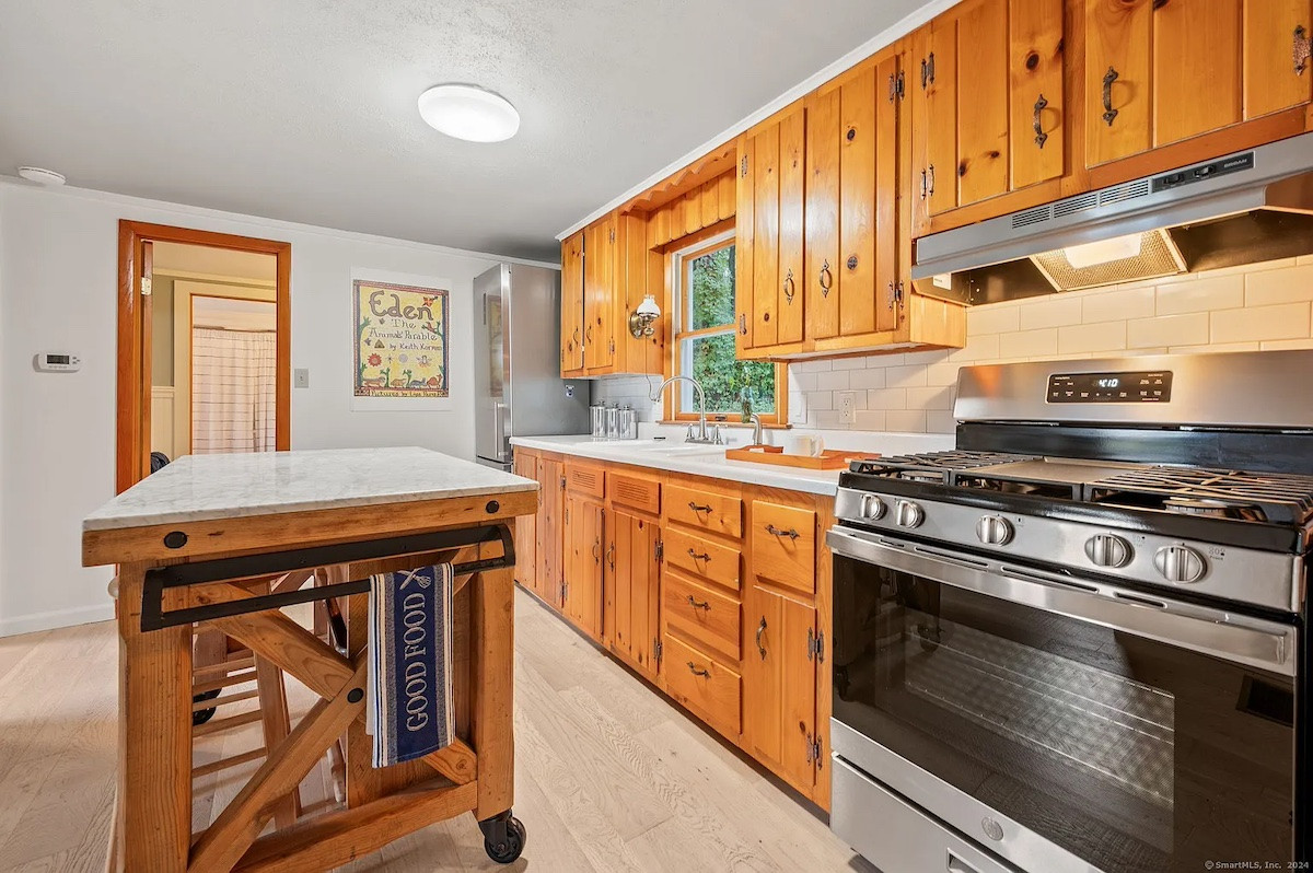 A single-level lake cottage in Sharon has one bedroom and one bathroom within 680 square feet. It has recently been updated with a new propane heating system and appliances. The den provides extra space for an office or guest room. There are hardwood floors, a gas log fireplace, and a patio. Listed at $339,788 by Berkshire Hathaway HomeServices New England Properties.