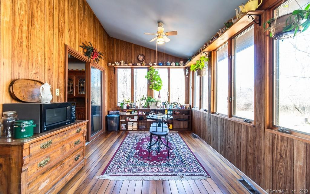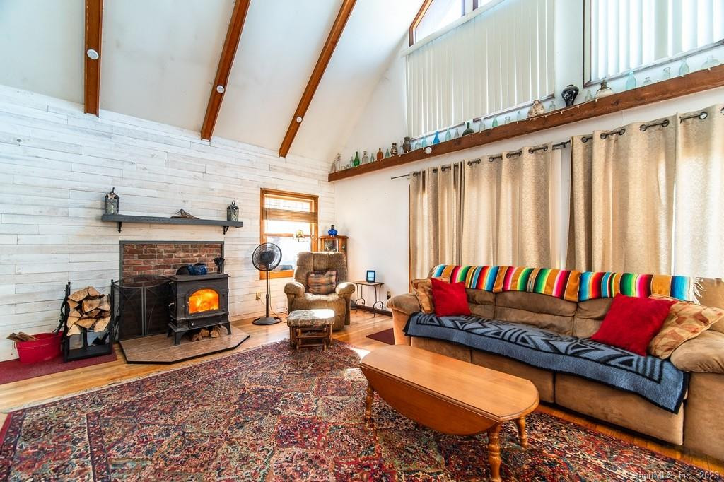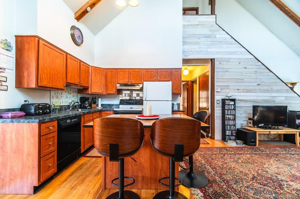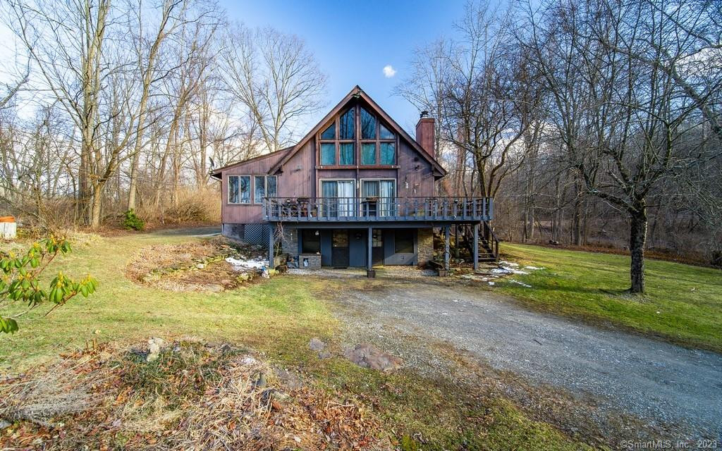 In Sharon, a three-bedroom, two-bedroom chalet-style home known as Raven's Cry is situated by a wildlife sanctuary. The A-frame house offers beamed cathedral ceilings, hardwood flooring, and many windows. An oversized three-car garage features a finished studio space above, perfect for an office, art studio, or secluded bedroom. Listed at $519,900 by Luxe Estates.