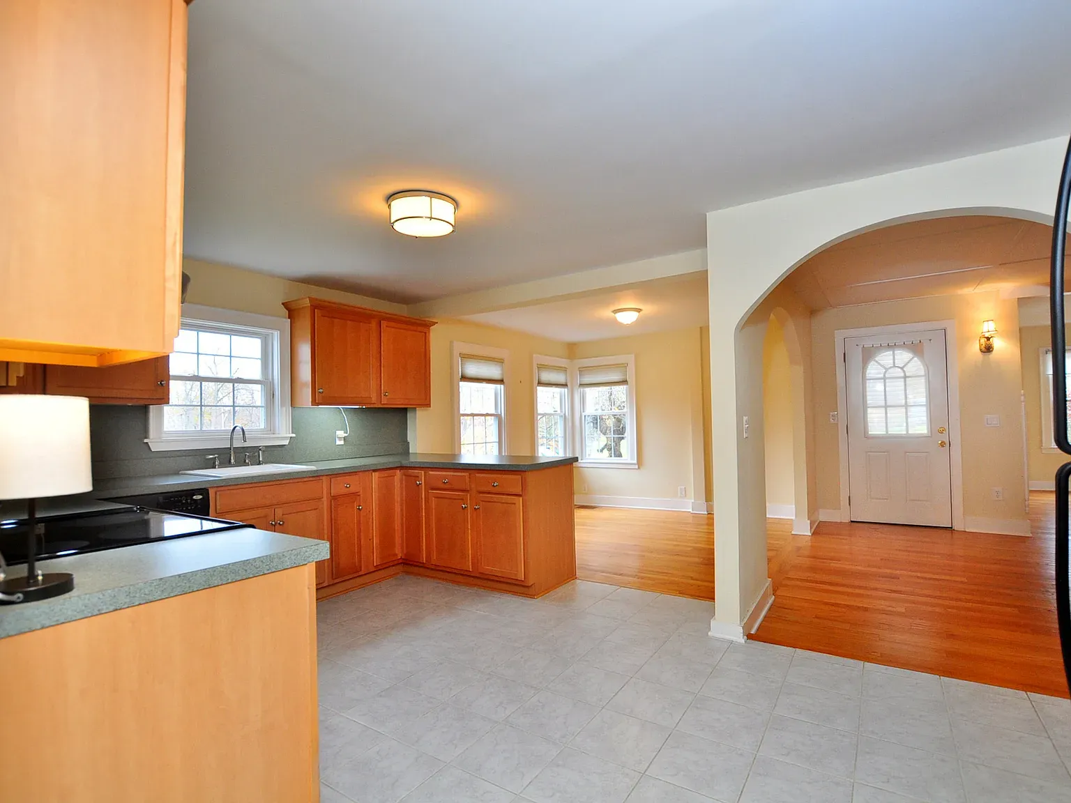 Inside, there is approximately 1,873 square feet of living space—including four bedrooms and three full baths—awaiting thoughtful refinement. The existing layout features generous room sizes and period-inspired details that provide a structural foundation for a range of design directions, from crisp modern minimalism to richly layered traditional interiors. Hardwood, tile, and carpeted floors traverse main living areas, while arched openings subtly nod to the home’s character.
