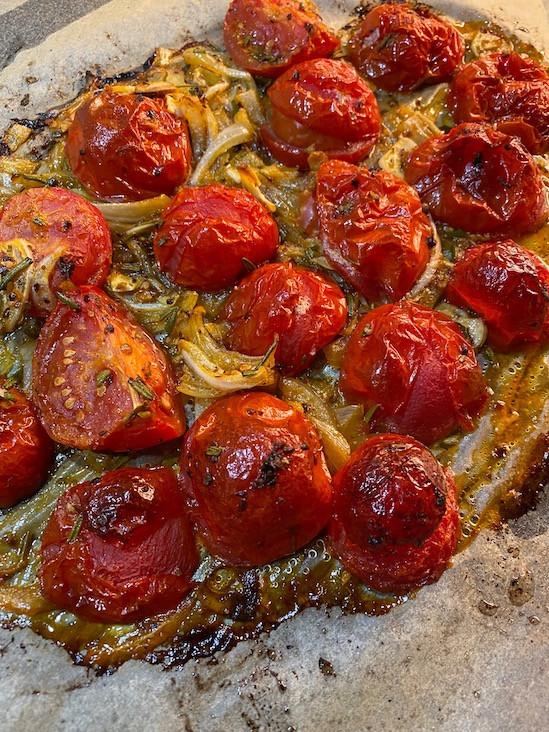 Lay out on a parchment-lined baking sheet with cut side down. Roast until tomatoes begin to brown and blistered — about 20 minutes.