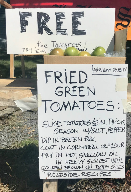 Seemingly, my friends and neighbors also have ample stashes of green tomatoes. So we set up a friendly green tomato giveaway stand including a Roadside Recipe for my Fried Green Tomatoes. We’re hoping to get some takers or at least a chuckle out of folks driving and jogging by. Maybe someone will be taking notes?