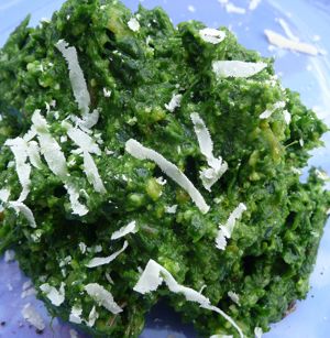 3. Puree the leaves together with the oil, stopping and scraping down the bowl as necessary to combine. (Work in two batches if you have a small food processor.) Add to the bowl and stir to combine with the salt.