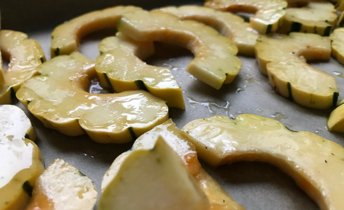 In a medium bowl, toss the tomato halves with the oil, syrup, salt, pepper and ginger. Use a slotted spoon to scoop the tomatoes out of the bowl to one side of the prepared baking sheet, arranging them cut side up and reserving the excess dressing in the bowl. Throw the squash slices into the bowl and mix them around with the sauce, lightly coating them. Arrange these in a single layer on the other side of the baking sheet. Slide the pan into the oven and roast, flipping the squash slices over after about 10 minutes, until the tomatoes are wrinkled and concentrated and the squash is tender and lightly browned in spots. Set aside to cool a bit.