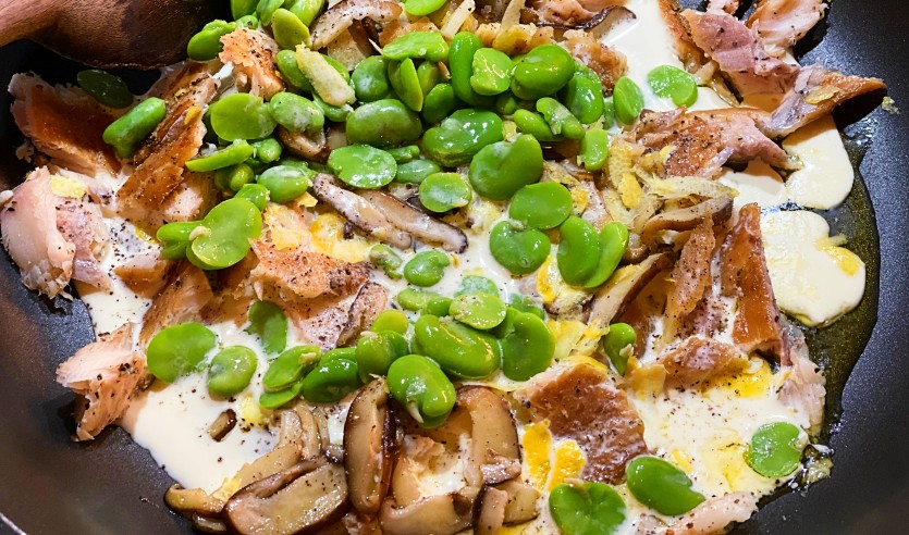 Bring to a simmer. Drain the pasta when fully cooked and add it to the pan. Add the shiitakes, favas and smoked trout and lemon zest and gently fold together. You don’t want to break up the trout too much.