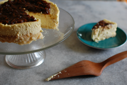 Yogurt Cheesecake with Dates and RosewaterFor the crust:¾ cup blanched almonds ¾ cup shredded, unsweetened coconut ¼ teaspoon salt ¼ cup sugar 8 tablespoons (1 stick) unsalted butter, melted and slightly cooled For the filling:1 pound (2 bricks) cream cheese, softened 1 cup plain yogurt 3 eggs ¼ cup sugar 1 teaspoon rosewater For the topping:1 cup pitted, roughly chopped dates ¼-1/2 cup water ¼ teaspoon ground cardamom 1 teaspoon rosewater 1. Preheat the oven to 350°F. Lay the nuts and coconut onto a baking sheet and bake for five minutes. Remove from the oven, and allow to cool for a few minutes. 2. Combine the nuts, coconut, salt, and sugar in the bowl of a food processor and pulse to combine. Add the butter and pulse a few times until the ingredients come together in a wet, buttery dough. Gently press the mixture into a greased 9-inch spring form pan. (You can also line the bottom with parchment, but be sure to grease the sides as well.) Put the pan on a rimmed baking sheet and bake until it darkens slightly, about 15 minutes. Remove from the crust from the oven and let it cool until it’s no longer hot to the touch. Reduce the oven temperature to 325°F. 3. While the crust cools, make the filling. Combine the cream cheese, yogurt, eggs, sugar, and rosewater in a blender or food processor. Blend until the mixture is smooth. 4. Surround the bottom and sides of the cake pan with aluminum foil. (You’re going to be baking the cake in a water bath, so you want to make sure the spring form pan is watertight.) Fill a kettle with water and bring it to a boil. Place the spring form pan in a larger baking pan, and pour the filling into the crust. Transfer the whole larger baking pan into the oven, and then, with the door open, pour boiling water into the larger pan so that it comes a few inches up the sides of the spring form. Bake until the cake is just barely solid in the center and slightly puffed, about 1 hour and 15 minutes. Remove from the water bath, and let cool. Chill in the refrigerator for at least two hours. You can add the date dotting before or after chilling, depending on your schedule. 5. For the topping: Combine the dates with ¼ cup water in a small saucepan over medium heat. Cook, stirring often, until the dates soften and absorb the water. Add more water as the mixture gets dry. After about 15 minutes, the dates should melt into a jammy consistency. Remove from heat, stir in the cardamom and rosewater, and cool. Pour overtop the cake.